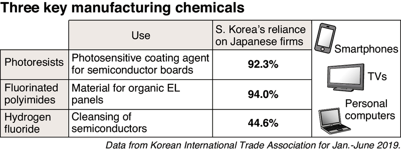 The three items are hydrogen fluorides used to clean semiconductors, photoresists applied to semiconductor boards, and fluorinated polyimides used in organic EL (electroluminescence) panels. Japanese firms hold large shares of global production for each of these items.
