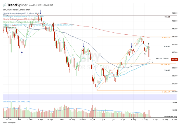 The SPY tried to reclaim the 10-day and 21-day moving averages — as well as the $416.50 zone — but last week failed to do so, with Friday’s action acting as a dagger to the bulls’ hopes.