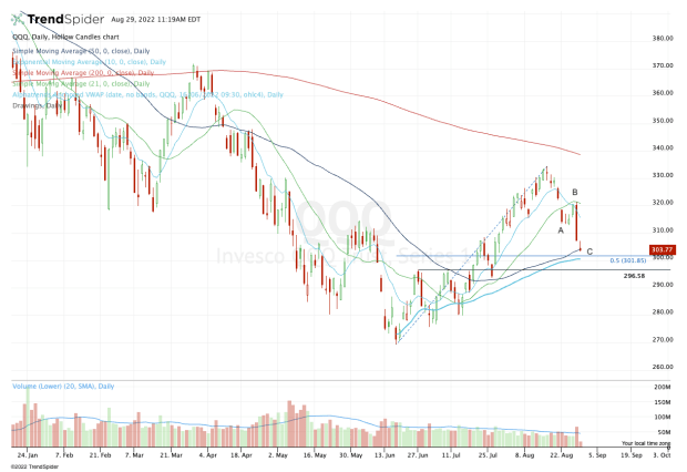 As it pertains to the charts, the QQQ is already testing the 50-day moving average, but the $300 to $304 zone is critical.