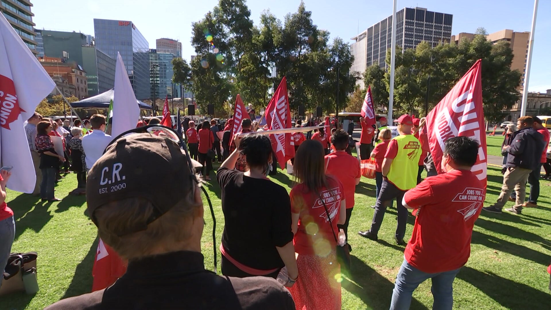 About 100 South Australian aged care employees used their day off to rally in Adelaide's CBD, demanding a 25 per cent pay rise and better staff-to-patient ratios.