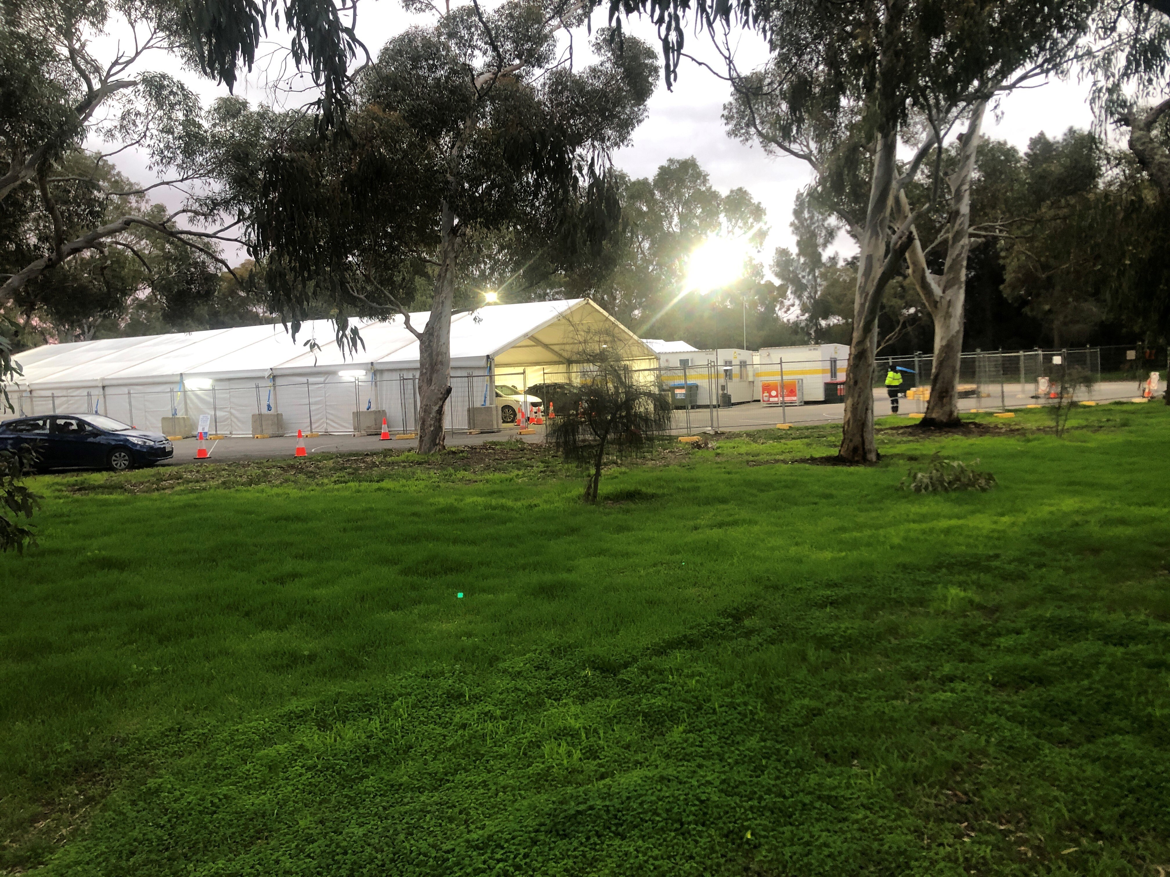 A new vaccination clinic opened today in the Adelaide Parklands, in Ellis Park, off Sir Donald Bradman Drive, ahead of the nearby Adelaide Showground clinic closing tomorrow, ahead of the Royal Adelaide Show.