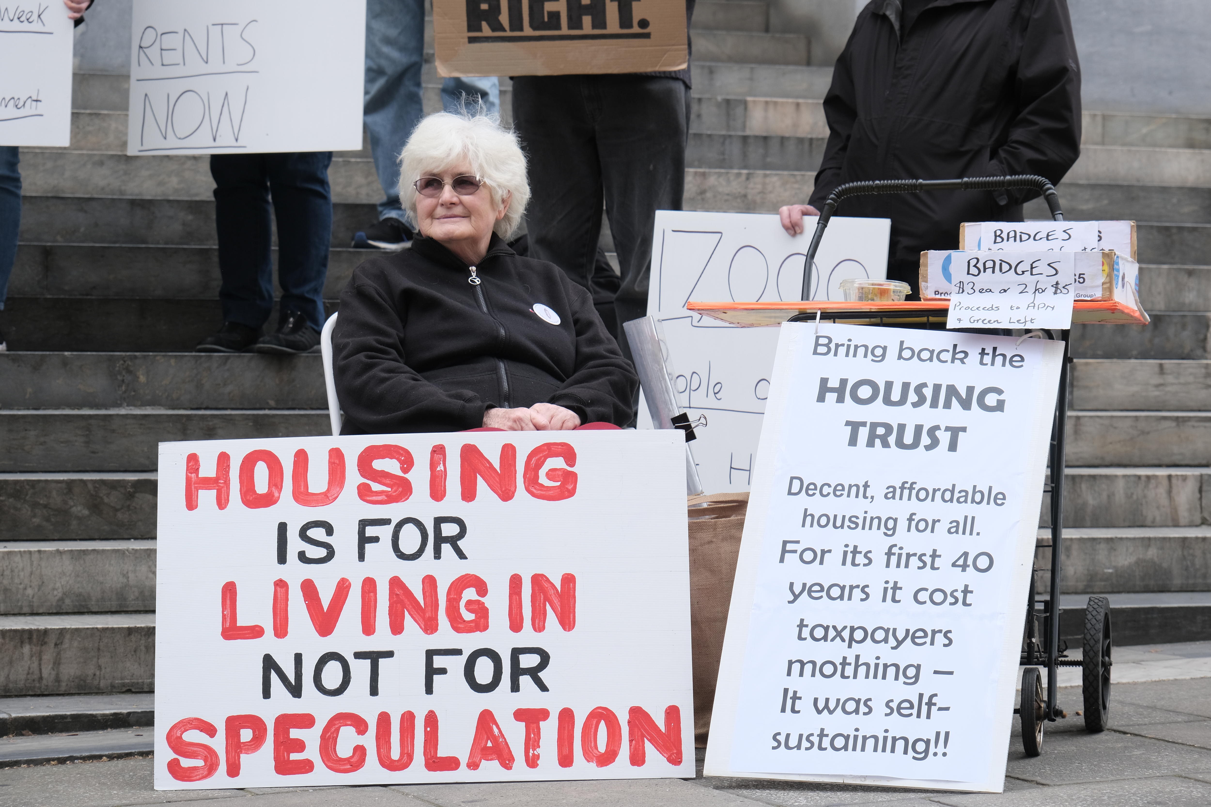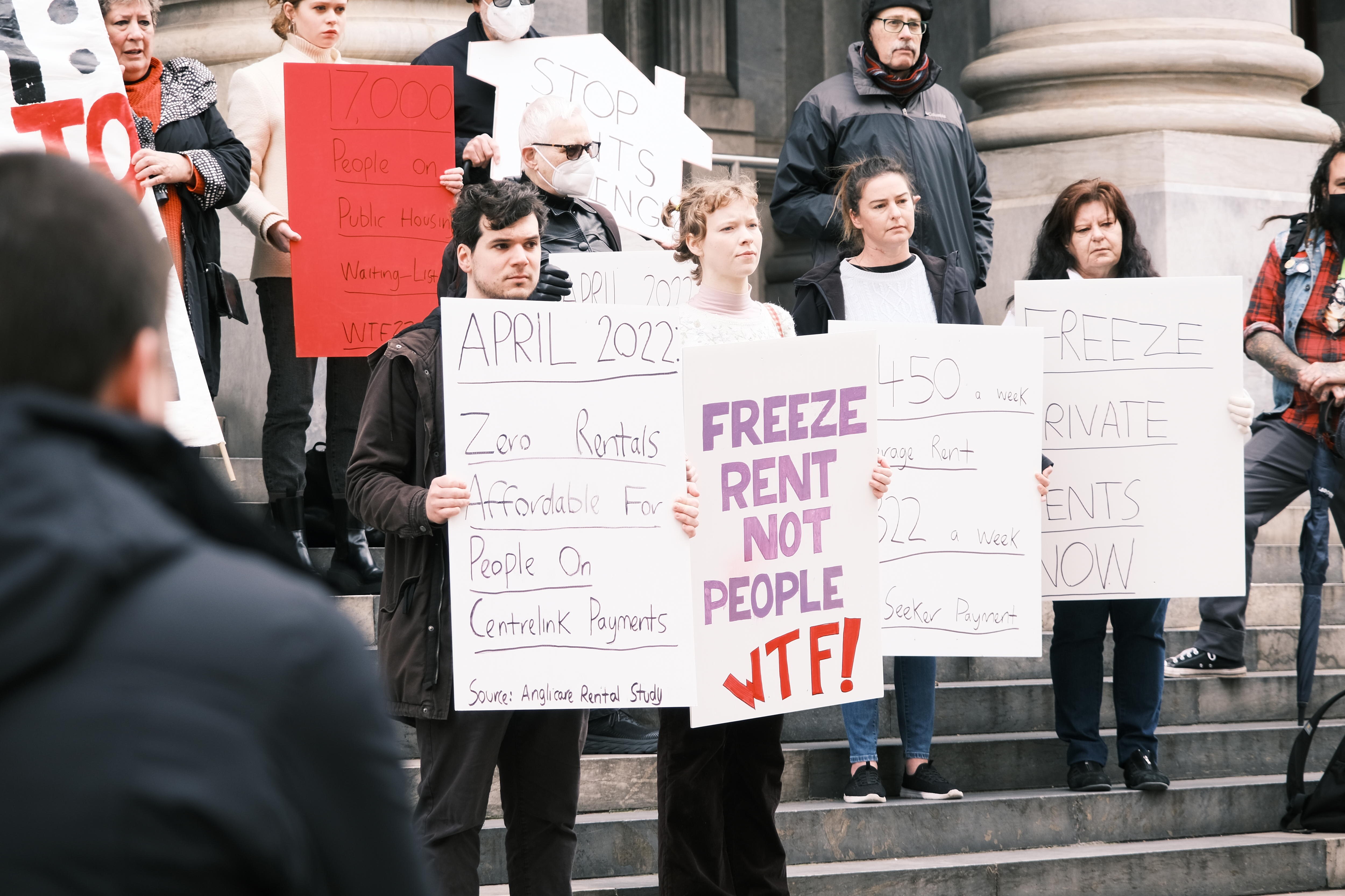 More than 40 people, including those sleeping rough, gathered to call for a freeze on rental prices and for an expansion of public housing.