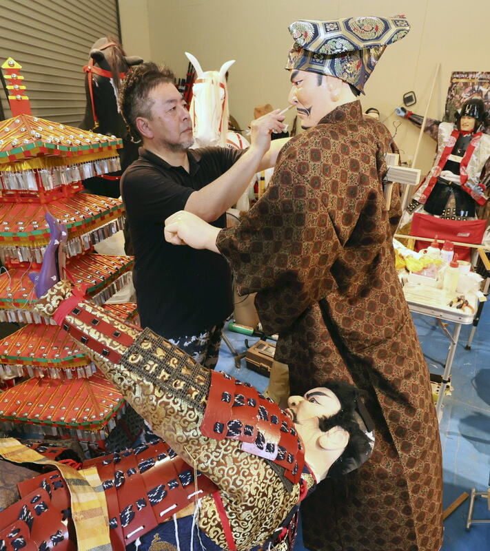 An artisan paints the face of a life-size doll in his workshop in Nakagawa, Fukuoka Prefecture, in preparation for the upcoming Hakata Gion Yamakasa festival. The dolls will be part of elaborate kazariyama displays that can be seen at 12 locations from July 1-15. "I've imbued this year's work with prayers that the pandemic can be brought under control," Hideaki Shirouzu said Saturday. "I hope the finished product will help make this summer all the more memorable in Hakata."