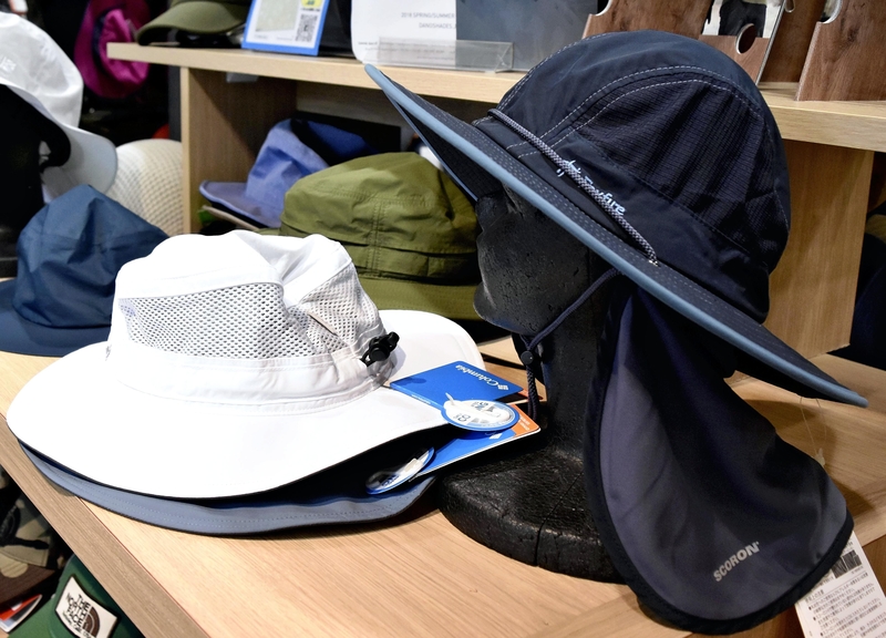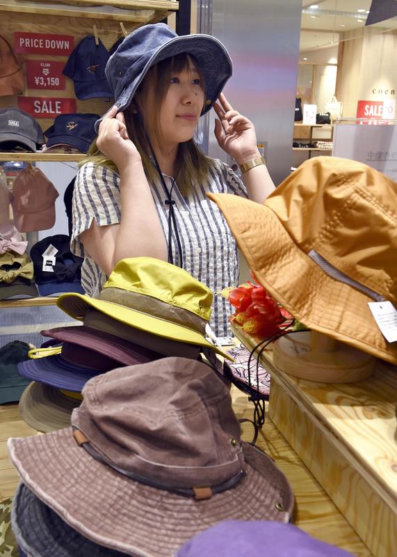 Ichiyon Plus, a hat store in the Trie Keio Chofu Shopping Center in Chofu, Tokyo, has a display of safari hats it recommends for sun protection when outdoors.