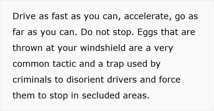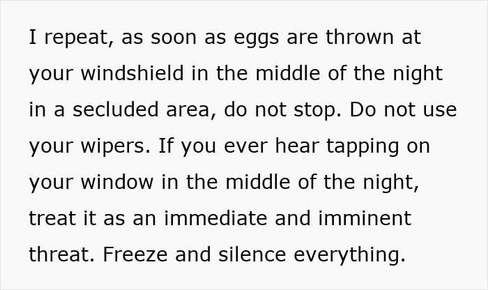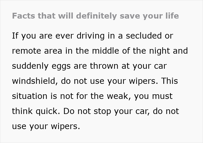 If eggs are thrown at your windshield while driving at night, don’t use the wipers and don’t stop the car