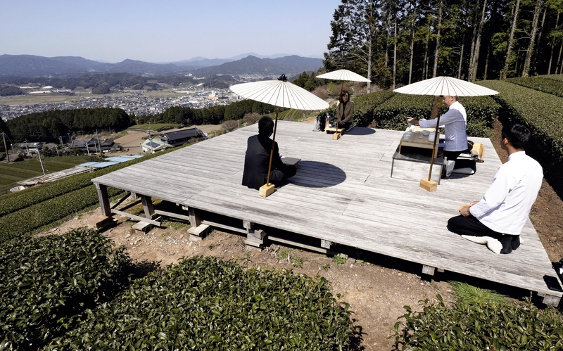 URESHINO, Saga -- Just a 10-minute drive from Ureshino's hot spring district, vibrant green tea fields cover a hillside at an elevation of about 200 meters. In a corner of the field stands an open-air teahouse without walls or roof. This unique space, which has a magnificent view over the fields and city below, is the centerpiece of the so-called Ureshino tea tourism campaign developed by this city in Saga Prefecture.