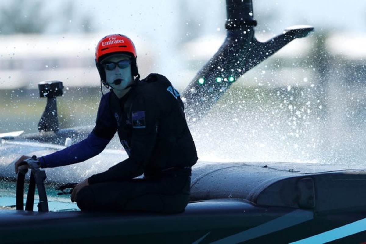 Thin and gangly, Burling says little while calmly steering Emirates Team New Zealand's 50-foot foiling catamaran at speeds approaching 50 knots (92.6 km per hour).