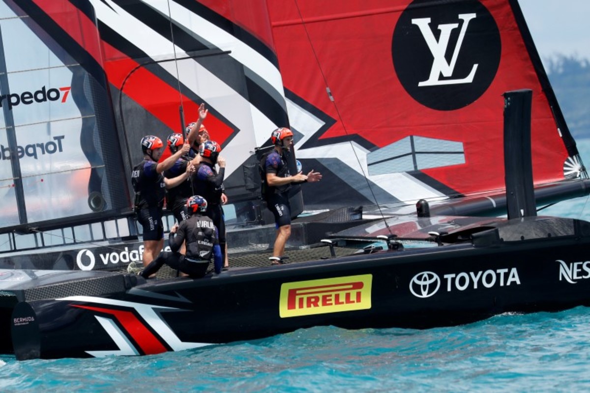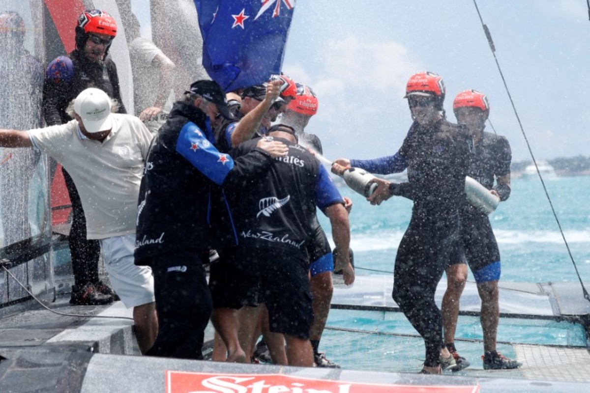 New Zealand won the right to take on the U.S. by beating four other "challengers" from Britain, France, Japan and Sweden, using cycling sailors dubbed "cyclors" to provide pedal power to control their catamaran's vast "wing" sail and hydrofoils.