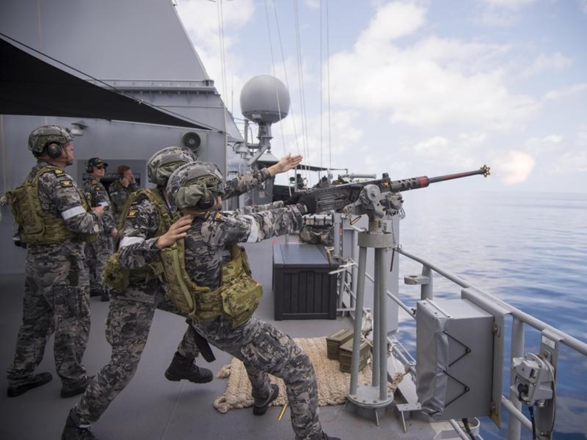 Their thunder and crackle was quickly drowned out as two machine gun crews fired volley after volley of blank 50-calibre rounds into the sky to protect their Anzac-class frigate.