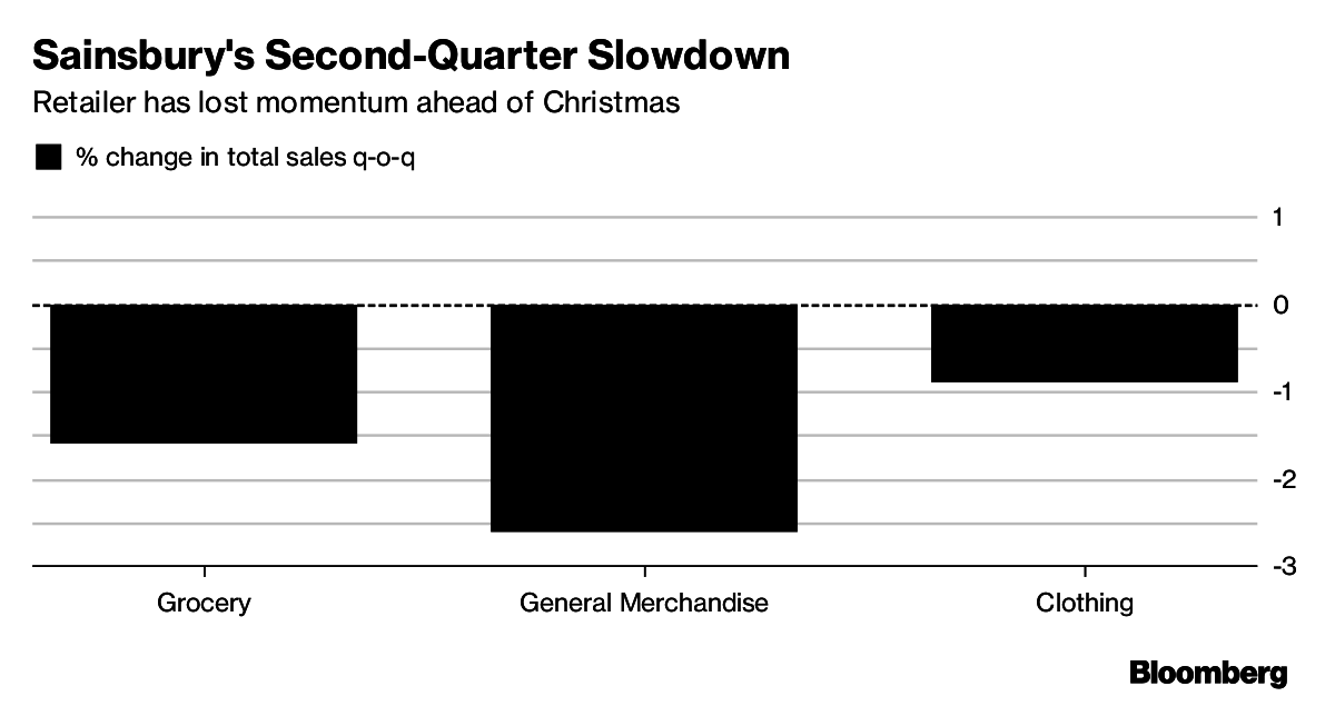 Sainsbury is far from the only retailer to be caught in a slowdown amid a squeeze on Britons’ disposable incomes. Cycling retailer Halfords Group Plc on Thursday reported first-half like-for-like retail sales growth of 1.9 percent, indicating a recent slowdown because growth was 3.5 percent in the first 20 weeks of the year.