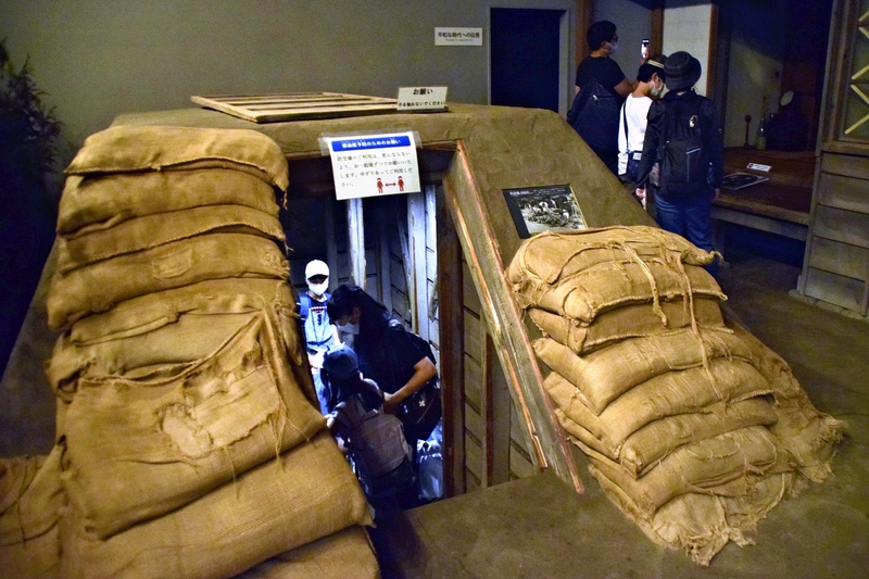 Visitors also have the chance to experience life during the war. In a replica of a classroom from the time, the blackboard has been replaced with a monitor. A video is playing a simulation of the day's moral education lesson. An ethical question is posed: "Do you want to become a soldier to defend Japan in a just war?" Such propaganda spurred children to participate in the war effort.