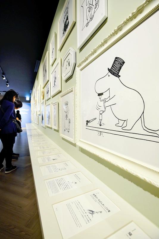 The very first drawing of Moomin, black with red eyes and eerie-looking, which Jansson did when she was a teenager and first started working on her creation, and other drawings showing the changes in Moomin's features, were also on exhibit, with visitors looking at them intently.