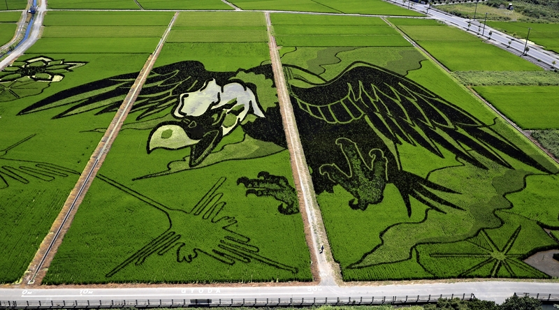 An enormous rice paddy artwork featuring a condor and the Nazca Lines of Peru is seen in Gyoda, Saitama Prefecture. The best time to see the work has arrived, coming about two weeks later than usual due to hot weather damage to the field, and continues until mid-November. Eight kinds of rice in varying colors were planted in the about 2.8-hectare paddy.