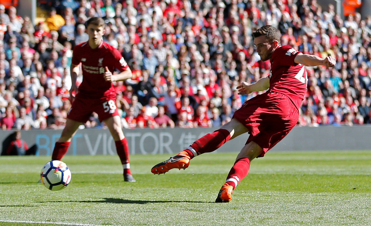 Soccer Football - Premier League - Liverpool vs Brighton & Hove Albion - Anfield, Liverpool, Britain - May 13, 2018 Liverpool's Andrew Robertson scores their fourth goal Action Images via Reuters/Carl Recine