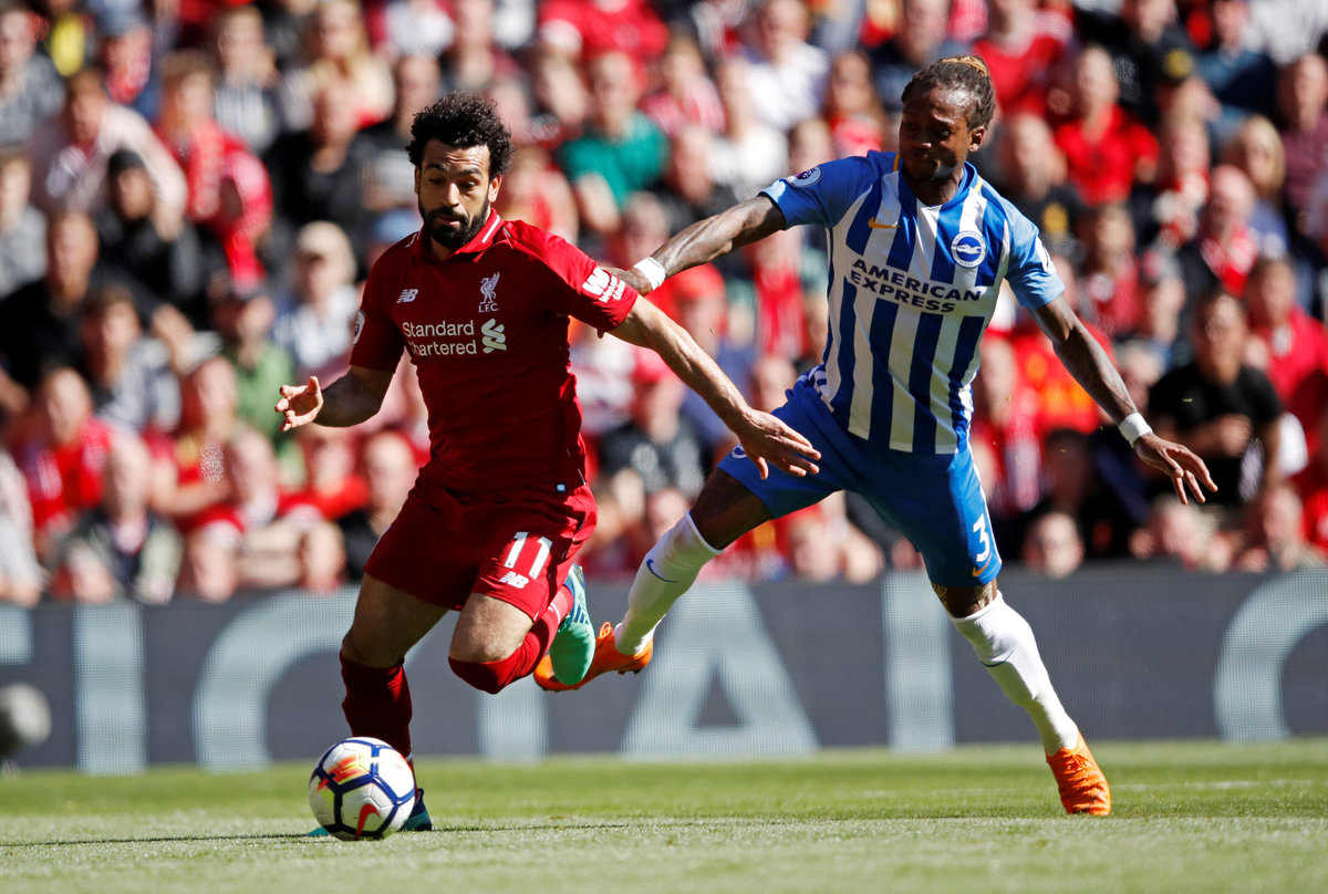 Soccer Football - Premier League - Liverpool vs Brighton & Hove Albion - Anfield, Liverpool, Britain - May 13, 2018 Liverpool's Mohamed Salah in action with Brighton's Gaetan Bong Action Images via Reuters/Carl Recine Soccer Football - Premier League - Liverpool vs Brighton & Hove Albion - Anfield, Liverpool, Britain - May 13, 2018 Liverpool's Mohamed Salah is hugged by manager Juergen Klopp as he is substituted Action Images via Reuters/Carl Recine
