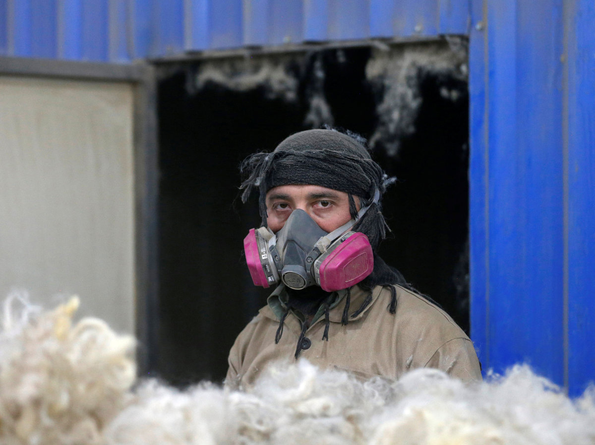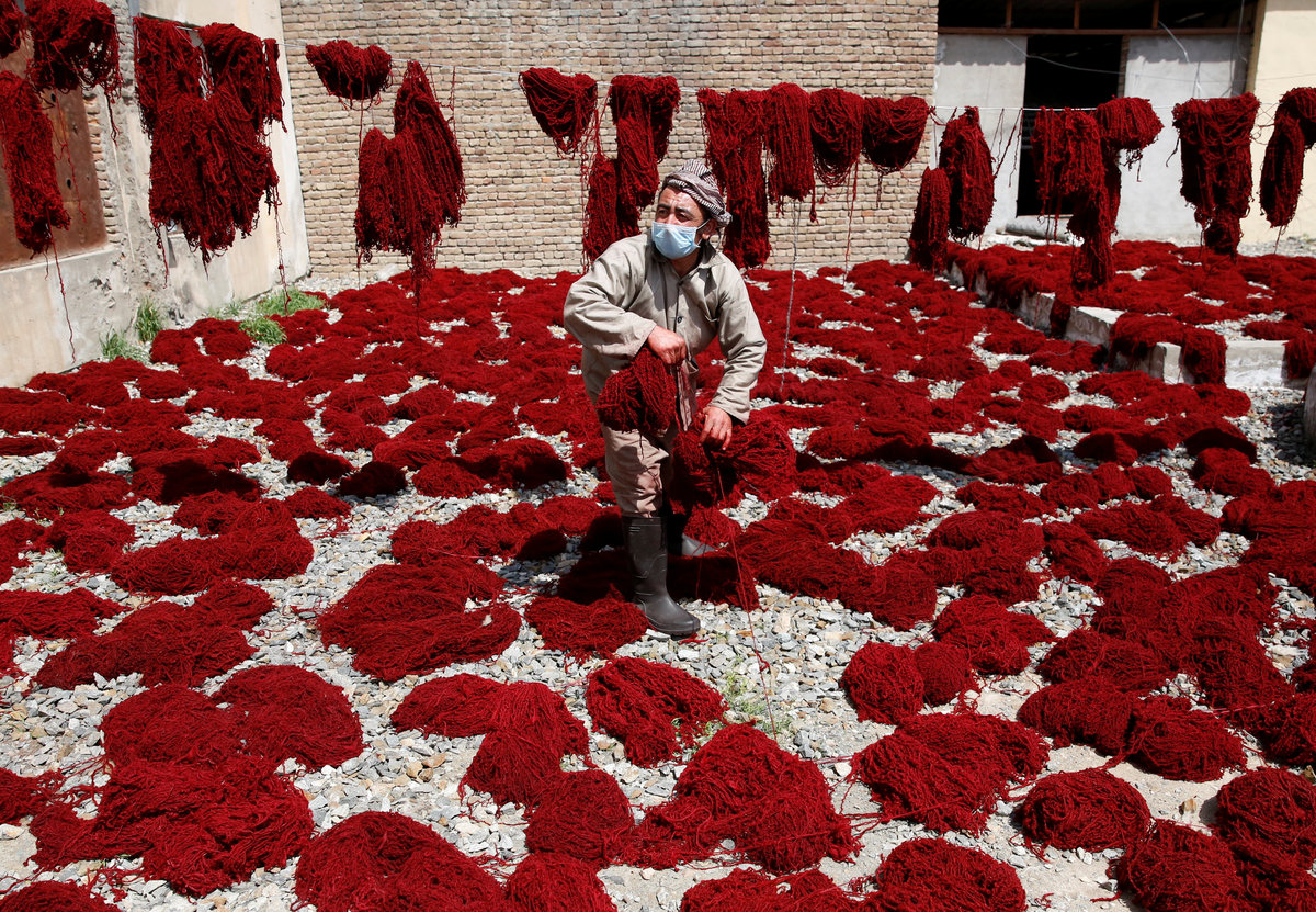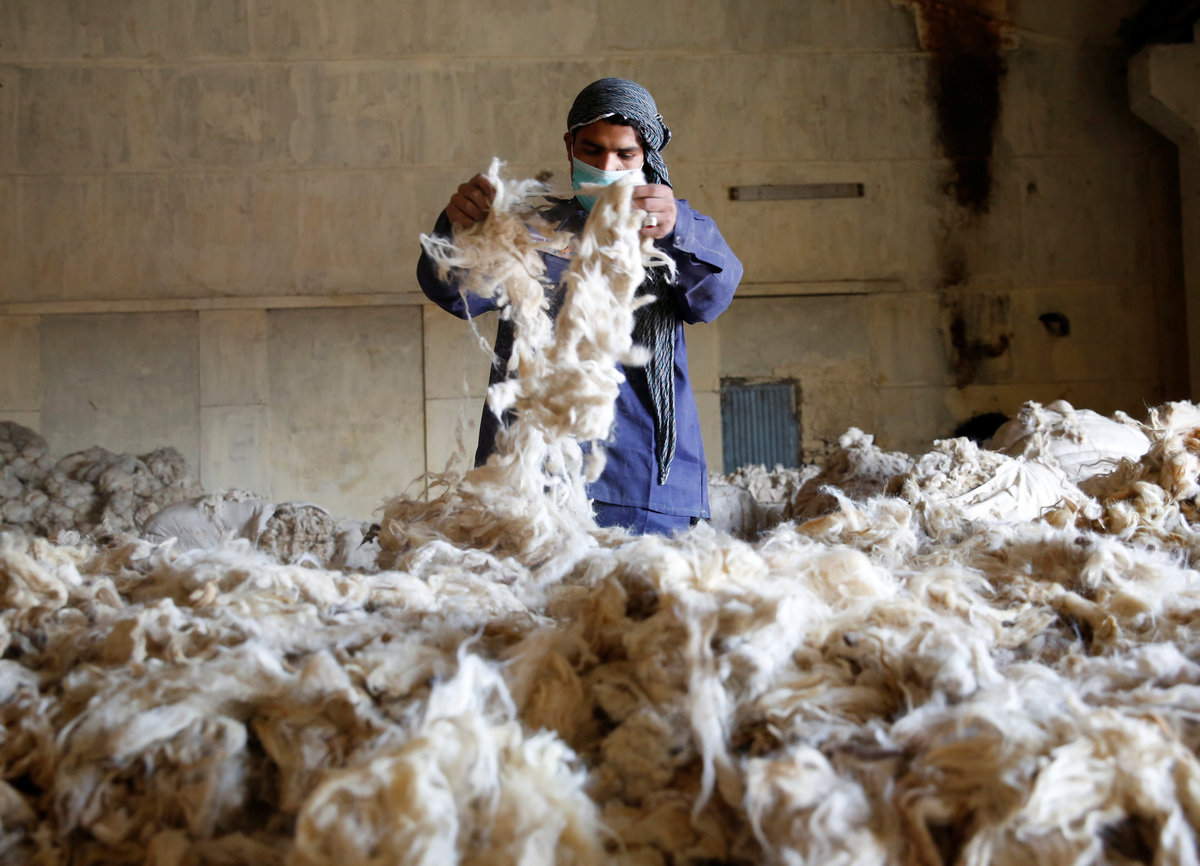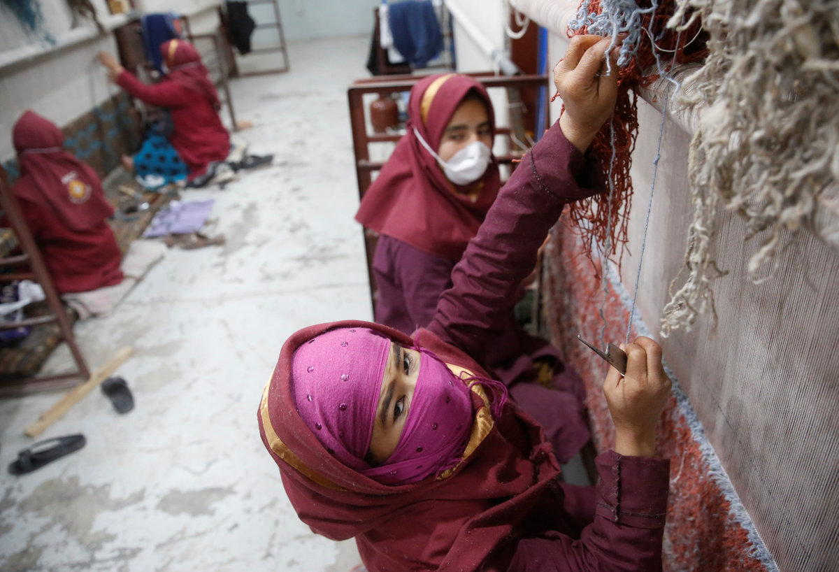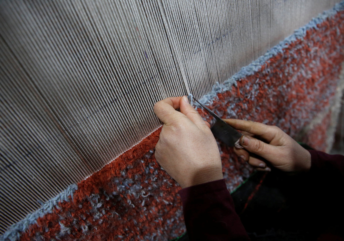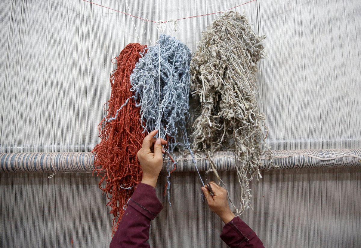 At a factory in Kabul, the capital, women weave on looms while men in dust-masks sort heaps of wool.