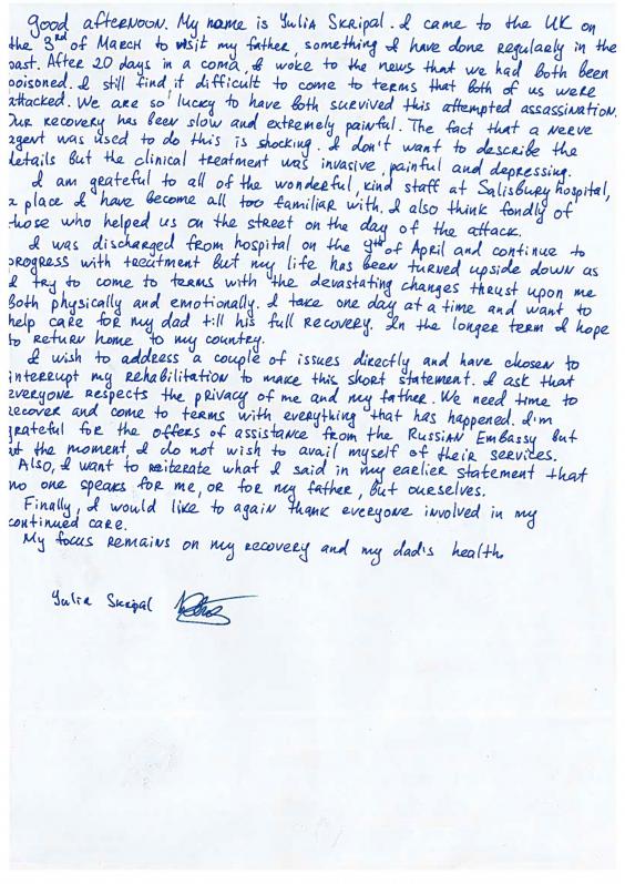 “I’m grateful for the offers of assistance from the Russian Embassy but at the moment I do not wish to avail myself of their services,” said Ms Skripal. “Also, I want to reiterate what I said in my earlier statement, that no one speaks for me, or for my father but ourselves.”
