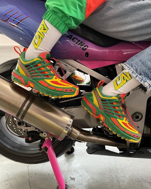 The sneakers, which appear in two color variants, contrast from Salomon’s usual makeups and instead opt for something much bolder. Nicknamed the “Kar ACS Pro,” the first is based in red mesh with yellow and green overlays. It’s a sight for sore eyes — whether that’s good or bad is up to you — and sets up an homage to L’Art’s vintage garage logo.
