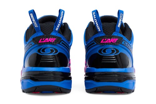 The other pair is equally as bold and comes inspired by Kar’s “Karwasaki” motorbike in gradient pink and blue. In this case, black serves as the accent shade on the mesh toes, inner liner, and detailing. Both sneakers feature hits of Salomon and L’Art branding on the toe, tongue, and heel, and a double heel tag takes its place at the rear.