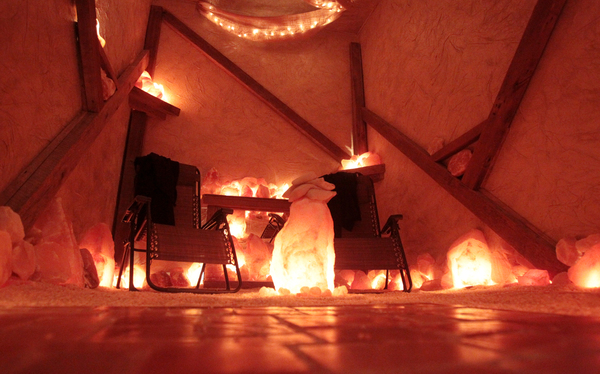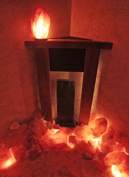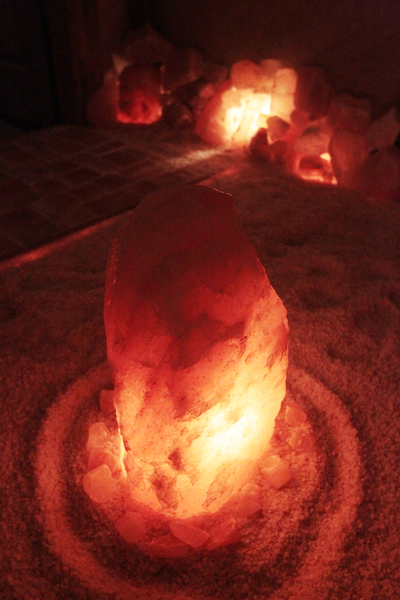 The room is dimly lighted, with peach-colored salt crystals covering the floor and larger rocks of salt lined up around the perimeter, perched on shelves and clustered beneath a mantel to give the effect of a fireplace. Many of the larger rocks are lighted from inside, producing a soft glow like firelight.