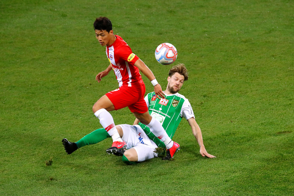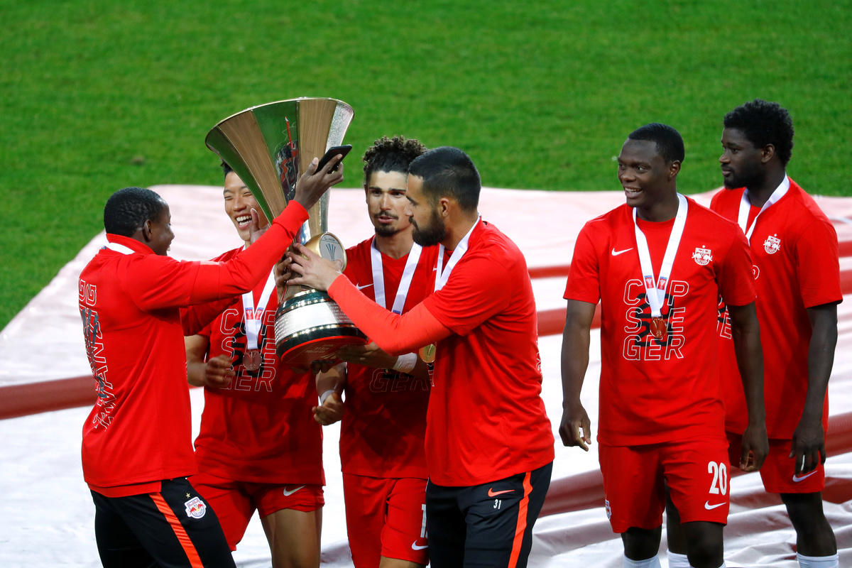 Soccer Football - Austrian Cup Final - FC Red Bull Salzburg v Austria Lustenau - Woerthersee Stadium, Klagenfurt, Austria - May 29, 2020 FC Red Bull Salzburg's Majeed Ashimeru celebrates after the match with the trophy. Play resumed behind closed doors following the outbreak of the coronavirus disease (COVID-19) REUTERS/Leonhard FoegerSoccer Football - Austrian Cup Final - FC Red Bull Salzburg v Austria Lustenau - Woerthersee Stadium, Klagenfurt, Austria - May 29, 2020 FC Red Bull Salzburg's Hwang Hee-chan in action with Austria Lustenau's Christoph Freitag as play resumes behind closed doors following the outbreak of the coronavirus disease (COVID-19) REUTERS/Leonhard FoegerSoccer Football - Austrian Cup Final - FC Red Bull Salzburg v Austria Lustenau - Woerthersee Stadium, Klagenfurt, Austria - May 29, 2020 FC Red Bull Salzburg's Majeed Ashimeru in action with Austria Lustenau's Obina as play resumes behind closed doors following the outbreak of the coronavirus disease (COVID-19) REUTERS/Leonhard FoegerSoccer Football - Austrian Cup Final - FC Red Bull Salzburg v Austria Lustenau - Woerthersee Stadium, Klagenfurt, Austria - May 29, 2020 FC Red Bull Salzburg's Noah Okafor scores their third goal, as play resumes behind closed doors following the outbreak of the coronavirus disease (COVID-19) REUTERS/Leonhard Foeger