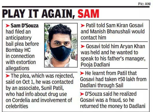 MUMBAI: A special investigation team (SIT) of city police, formed to probe allegations of extortion in the arrest of actor Shah Rukh Khan’s son Aryan, on Monday recorded the statement of Sam D’Souza, who helped NCB witness K P Gosavi to get in touch with Khan’s manager, Pooja Dadlani.