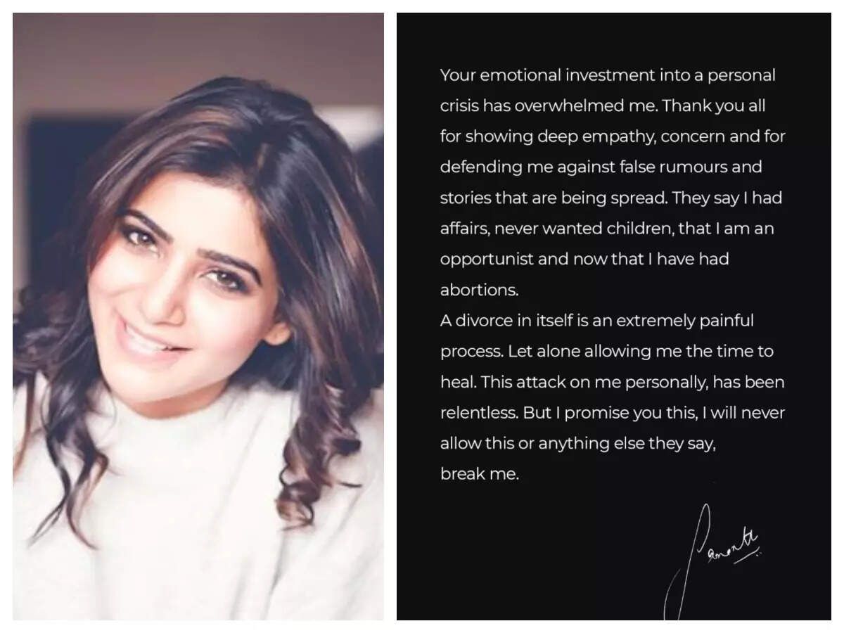 Samantha took to her social media handles to pen a note of gratitude for people who supported her through her separation with Naga Chaitanya. The actress also added that she will never allow this or anything else they say to break her.
