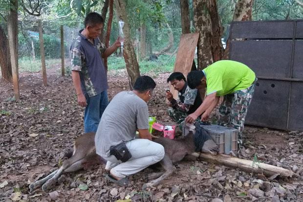 The tourists called for help from wildlife officials and border patrol police, who managed to extract the deer and brought it to the Khao Prathap Chang wildlife breeding station in Chom Bueng district for medical treatment.