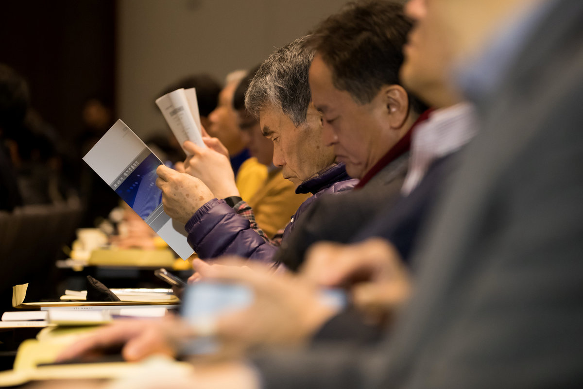 Shareholders look at annual reports during the Samsung Electronics Co. annual general meeting at the company's Seocho office building in Seoul, South Korea, March 23, 2018. SeongJoon Cho/Pool via Reuters