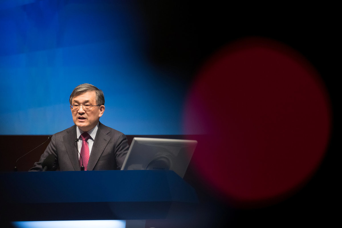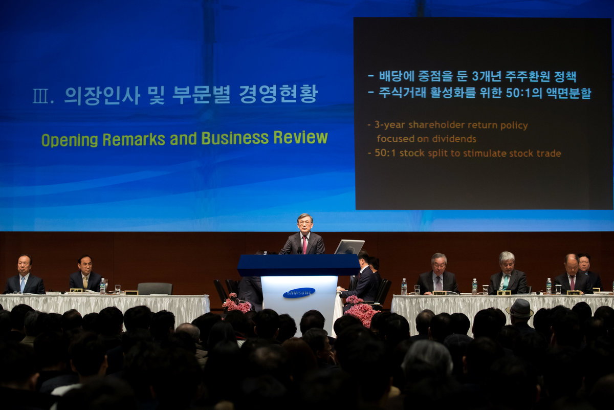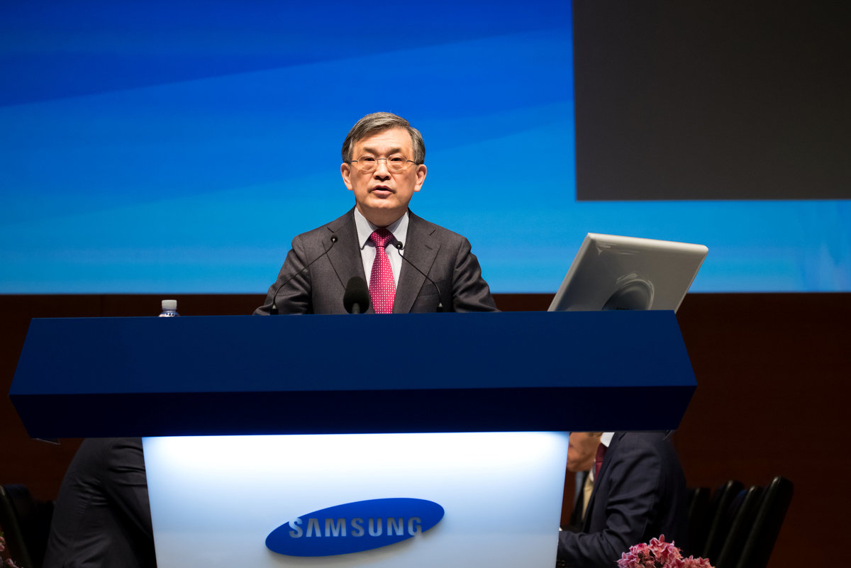 The logo of Samsung Electronics is seen at its office building in Seoul, South Korea, March 23, 2018. REUTERS/Kim Hong-JiKim Ki-nam, president and co-chief executive officer of Samsung Electronics Co., speaks during the company's annual general meeting at the company's Seocho office building in Seoul, South Korea, March 23, 2018. SeongJoon Cho/Pool via ReutersKwon Oh-hyun, chairman of Technology Research at Samsung Electronics Co., speaks during the company's annual general meeting at the company's Seocho office building in Seoul, South Korea, March 23, 2018. SeongJoon Cho/Pool via ReutersThe logo of Samsung Electronics is seen at its office building in Seoul, South Korea, March 23, 2018. REUTERS/Kim Hong-JiKwon Oh-hyun, chairman of Technology Research at Samsung Electronics Co., speaks during the company's annual general meeting at the company's Seocho office building in Seoul, South Korea, March 23, 2018. SeongJoon Cho/Pool via ReutersKwon Oh-hyun, chairman of Technology Research at Samsung Electronics Co., speaks during the company's annual general meeting at the company's Seocho office building in Seoul, South Korea, March 23, 2018. SeongJoon Cho/Pool via ReutersKwon Oh-hyun, chairman of Technology Research at Samsung Electronics Co., drinks a glass of water during the company's annual general meeting at the company's Seocho office building in Seoul, South Korea, on Friday, March 23, 2018. SeongJoon Cho/Pool via Reuters
