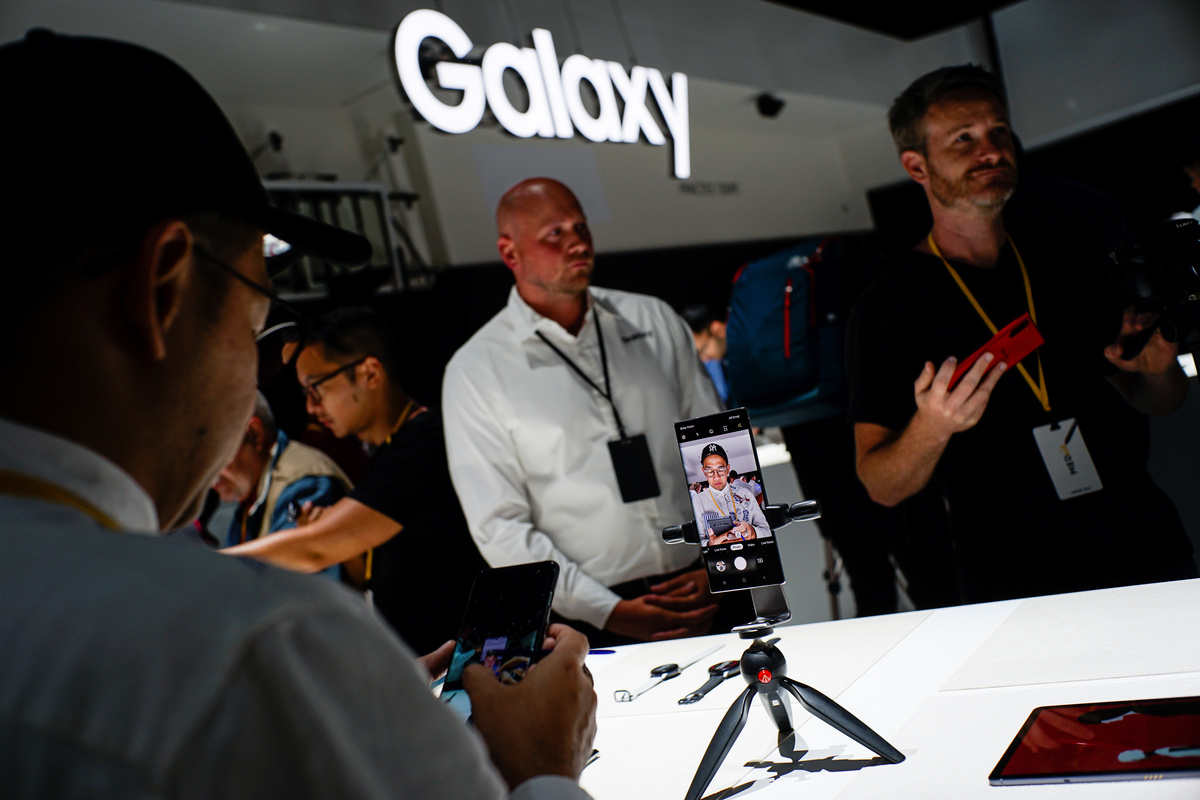 People test new devices during the launch event of the Samsung Galaxy Note 10 at the Barclays Center in Brooklyn, New York, U.S., August 7, 2019. REUTERS/Eduardo Munoz