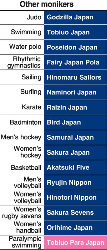 The national women's soccer team is Nadeshiko Japan, the baseball team is Samurai Japan and the artistic swimming squad is known as Mermaid Japan. While these monikers have become well known, other national teams have also adopted nicknames, such as sailing's Hinomaru Sailors and judo's Godzilla Japan, that they hope will capture the hearts of the public at the 2020 Tokyo Olympics and Paralympics.