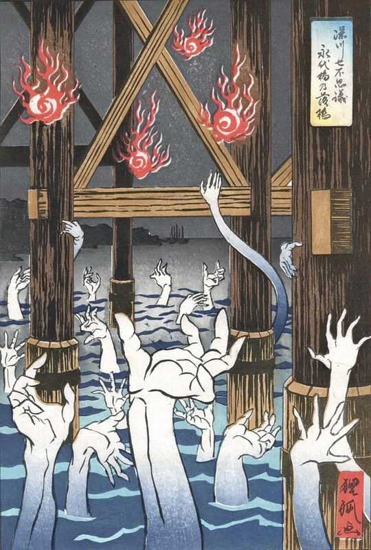 The "seven mysterious Fukagawa" tales, featuring places such as the ward's Fukagawa district, had been passed down from that time. One tells of the collapse of the Eitaibashi bridge under the weight of a festival crowd that fell into the river and died. Their voices are then heard late at night.