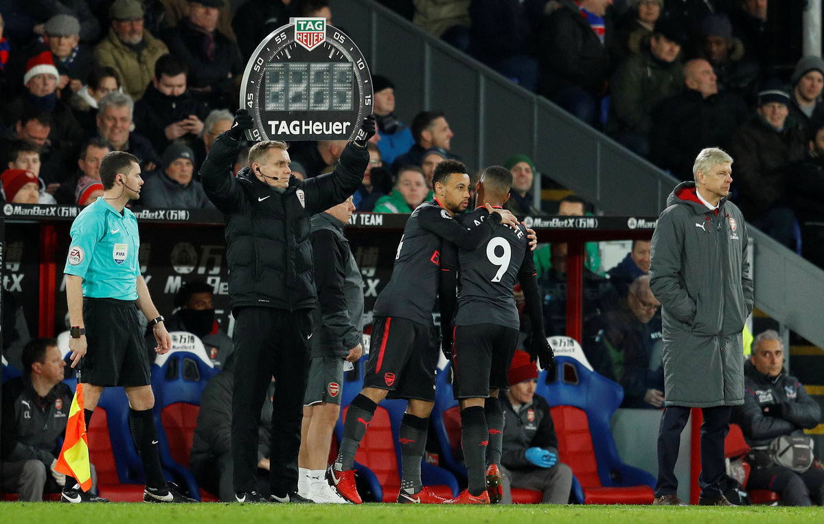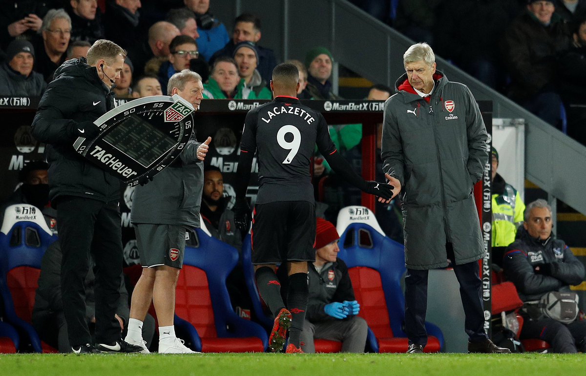 Soccer Football - Premier League - Crystal Palace vs Arsenal - Selhurst Park, London, Britain - December 28, 2017 Arsenal's Francis Coquelin comes on as a substitute to replace Alexandre Lacazette as manager Arsene Wenger looks on REUTERS/Peter Nicholls