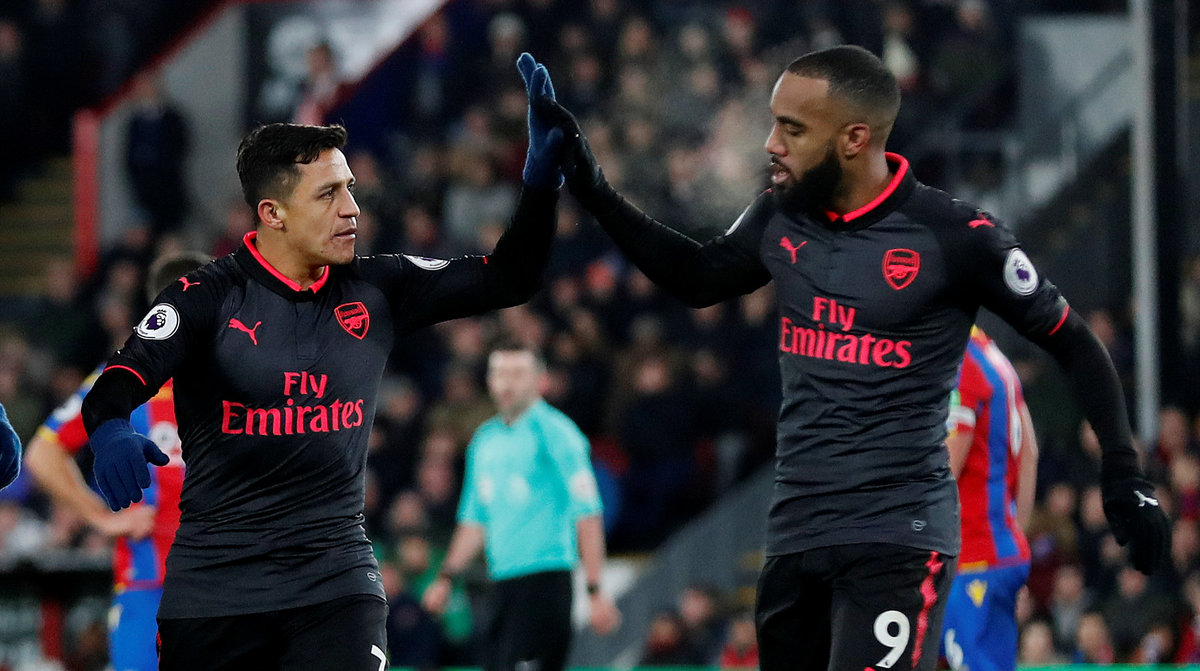 Soccer Football - Premier League - Crystal Palace vs Arsenal - Selhurst Park, London, Britain - December 28, 2017 Arsenal's Alexis Sanchez celebrates scoring their second goal with Alexandre Lacazette Action Images via Reuters/Matthew Childs