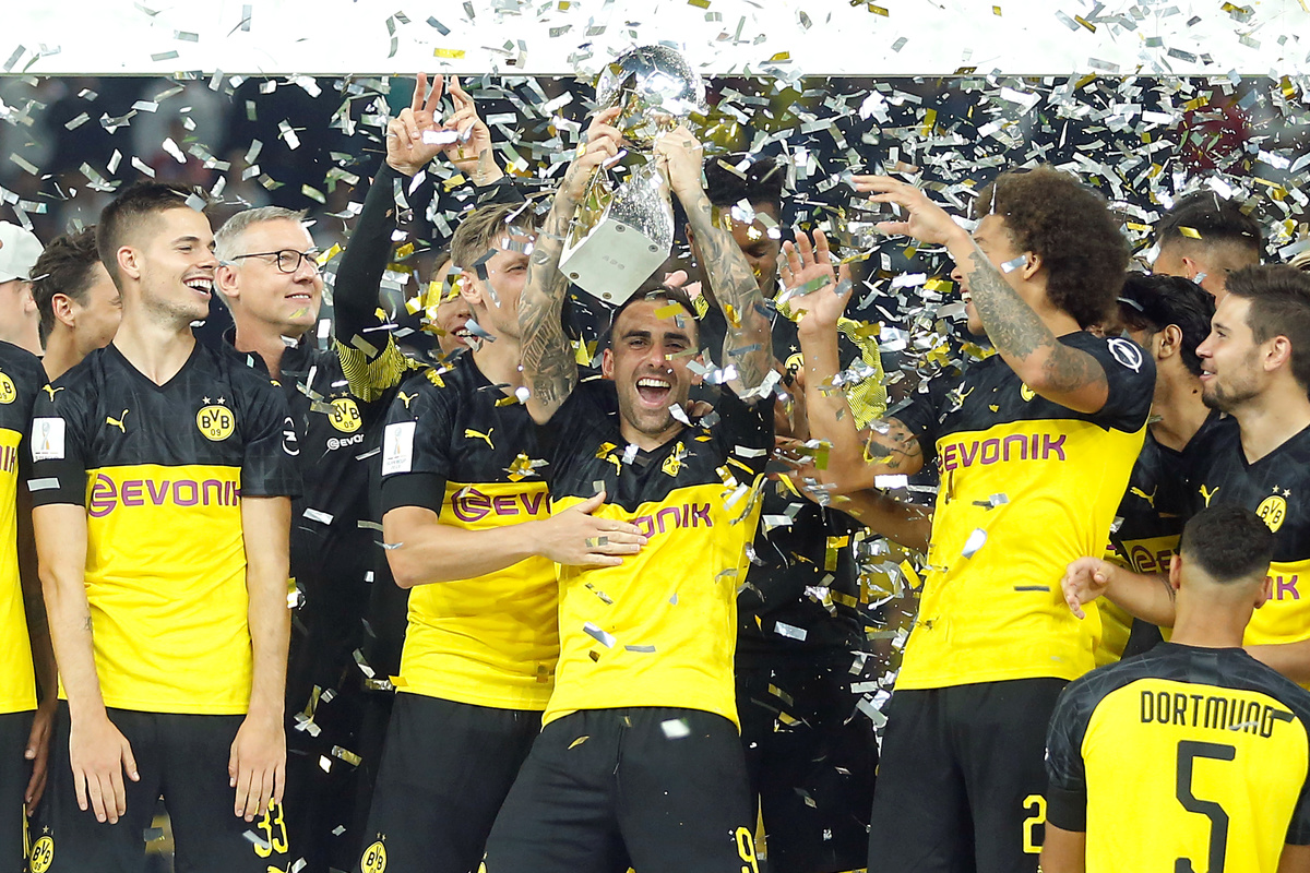 Soccer Football - German Super Cup - Borussia Dortmund v Bayern Munich - Signal Iduna Park, Dortmund, Germany - August 3, 2019 Borussia Dortmund's Paco Alcacer and teammates celebrate with the trophy after winning the German Super Cup REUTERS/Leon Kuegeler