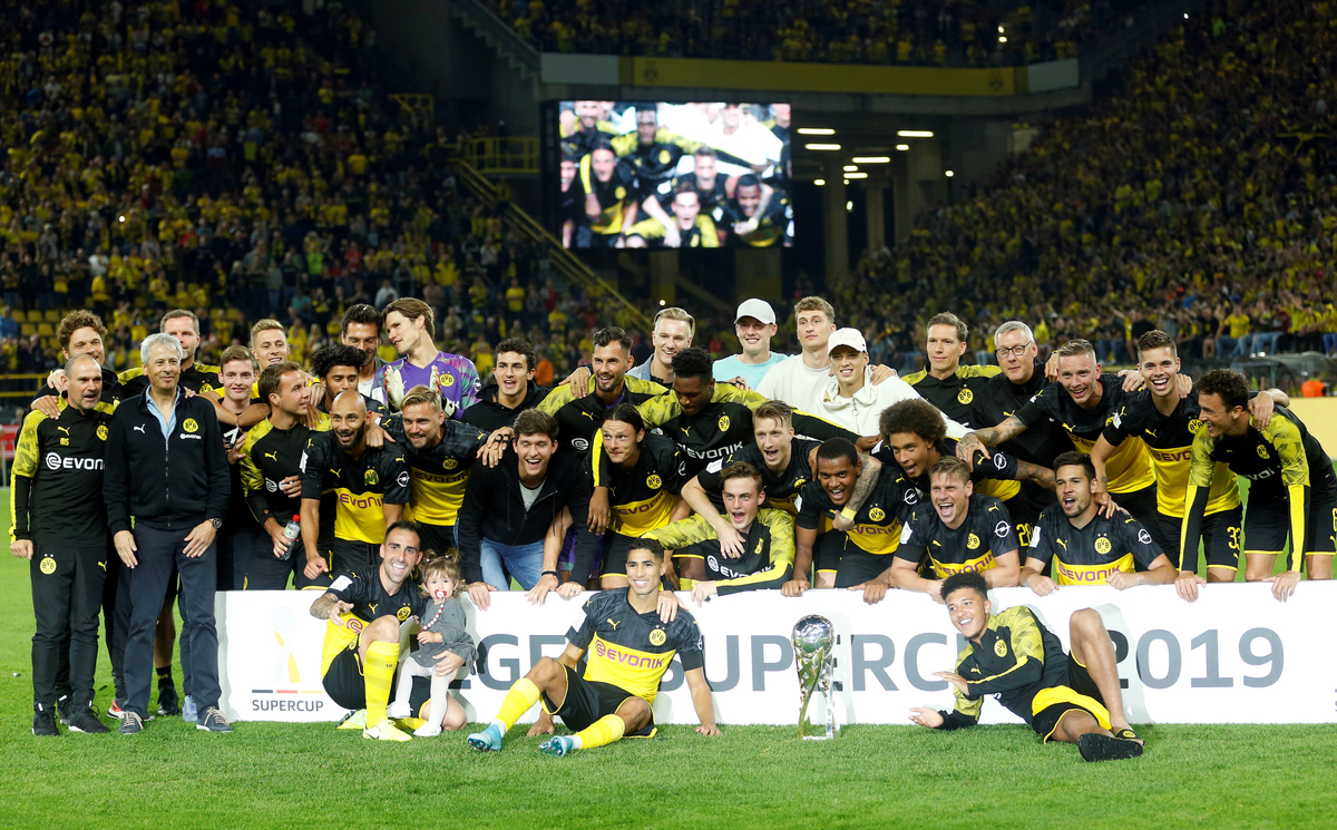 Soccer Football - German Super Cup - Borussia Dortmund v Bayern Munich - Signal Iduna Park, Dortmund, Germany - August 3, 2019 Borussia Dortmund celebrate with the trophy after winning the German Super Cup REUTERS/Leon Kuegeler