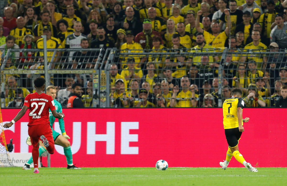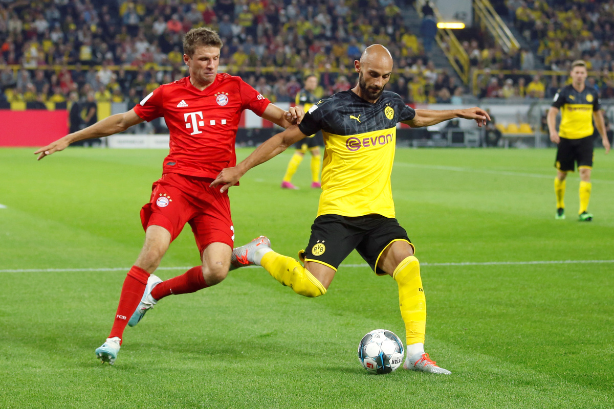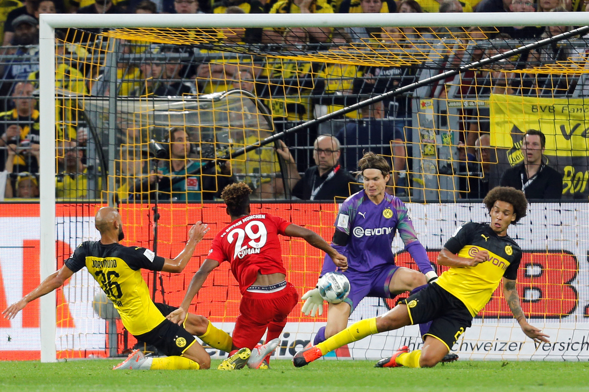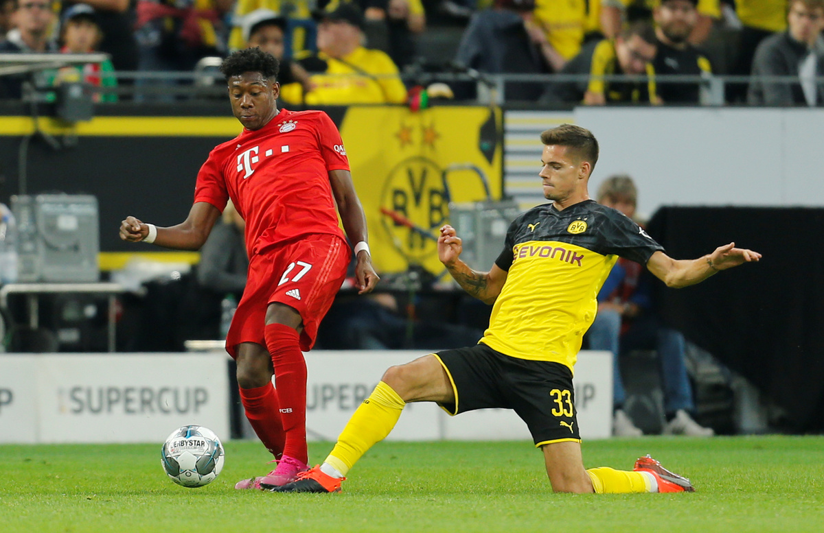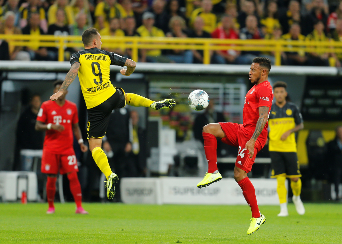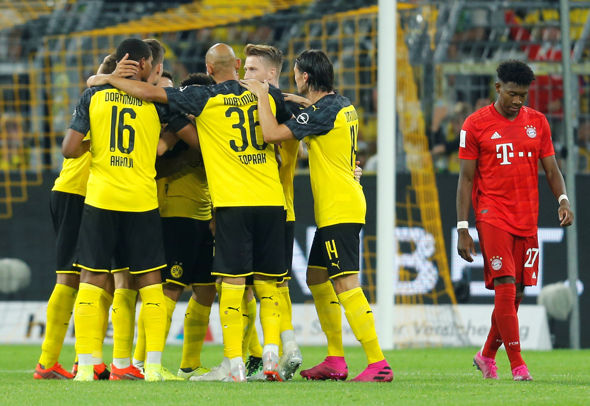 Soccer Football - German Super Cup - Borussia Dortmund v Bayern Munich - Signal Iduna Park, Dortmund, Germany - August 3, 2019 Bayern Munich's Thomas Muller in action with Borussia Dortmund's Omer Toprak REUTERS/Leon KuegelerSoccer Football - German Super Cup - Borussia Dortmund v Bayern Munich - Signal Iduna Park, Dortmund, Germany - August 3, 2019 Borussia Dortmund's Jadon Sancho scores their second goal REUTERS/Leon KuegelerSoccer Football - German Super Cup - Borussia Dortmund v Bayern Munich - Signal Iduna Park, Dortmund, Germany - August 3, 2019 Borussia Dortmund's Paco Alcacer celebrates scoring their first goal with teammates REUTERS/Leon KuegelerSoccer Football - German Super Cup - Borussia Dortmund v Bayern Munich - Signal Iduna Park, Dortmund, Germany - August 3, 2019 Bayern Munich's Kingsley Coman shoots at goal REUTERS/Leon KuegelerSoccer Football - German Super Cup - Borussia Dortmund v Bayern Munich - Signal Iduna Park, Dortmund, Germany - August 3, 2019 Bayern Munich's David Alaba in action with Borussia Dortmund's Julian Weigl REUTERS/Leon KuegelerSoccer Football - German Super Cup - Borussia Dortmund v Bayern Munich - Signal Iduna Park, Dortmund, Germany - August 3, 2019 Bayern Munich's Corentin Tolisso in action with Borussia Dortmund's Paco Alcacer REUTERS/Leon Kuegeler