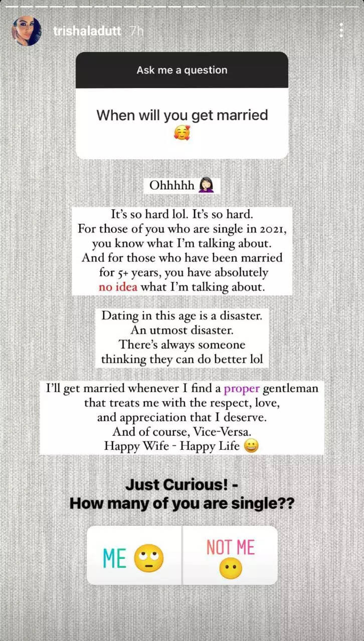 One of her fans asked the star daughter about her wedding plans. Replying to the same, Trishala said, ‘Ohhhhh. It's so hard lol. It's so hard. For those of you who are single in 2021, you know what I'm talking about. And for those who have been married for 5+ years, you have absolutely no idea what I'm talking about.’