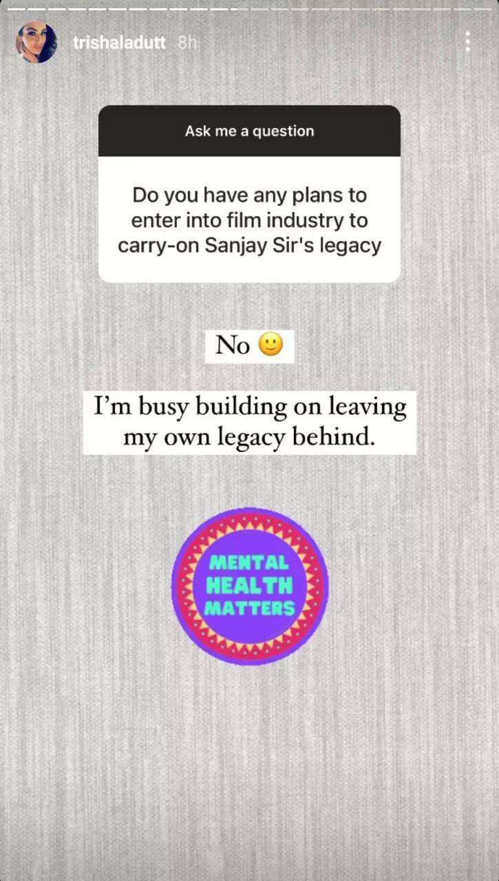 Although Trishala has made it clear a number of times in the past about her non-interest in show business, a fan was eager to know if she is venturing into Bollywood to follow father Sanjay Dutt’s legacy. She replied saying, ‘No. I am busy building on leaving my own legacy behind.’