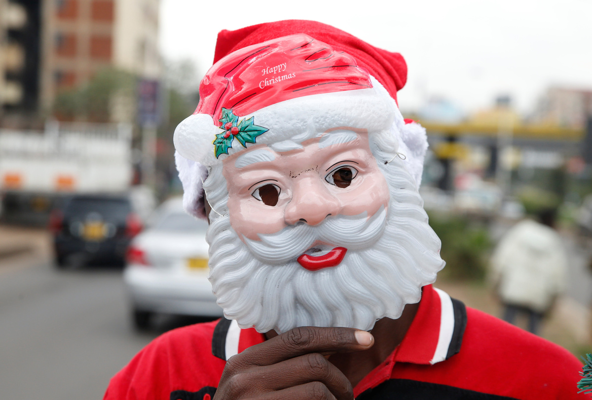 Street vendor, Kone Aicha, 27, wearing Santa Claus hat and beard sells Christmas items in Adjame neighbourhood in Abidjan, Ivory Coast December 18, 2018. REUTERS/Luc GnagoPatrick Ngatia, a street merchant, wears a plastic Santa Claus mask as he prepares to peddle Christmas commodities to motorists along Kipande road near the central business district of Nairobi, Kenya December 19, 2018. REUTERS/Njeri Mwangi