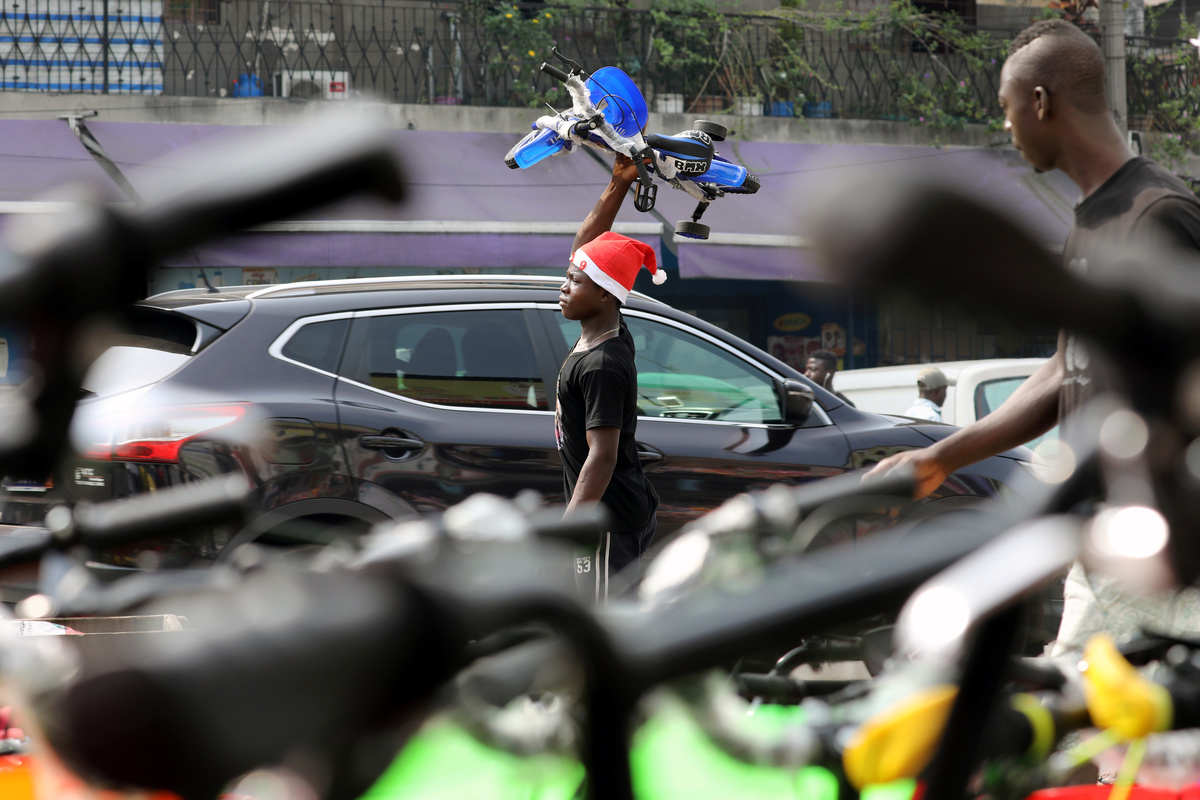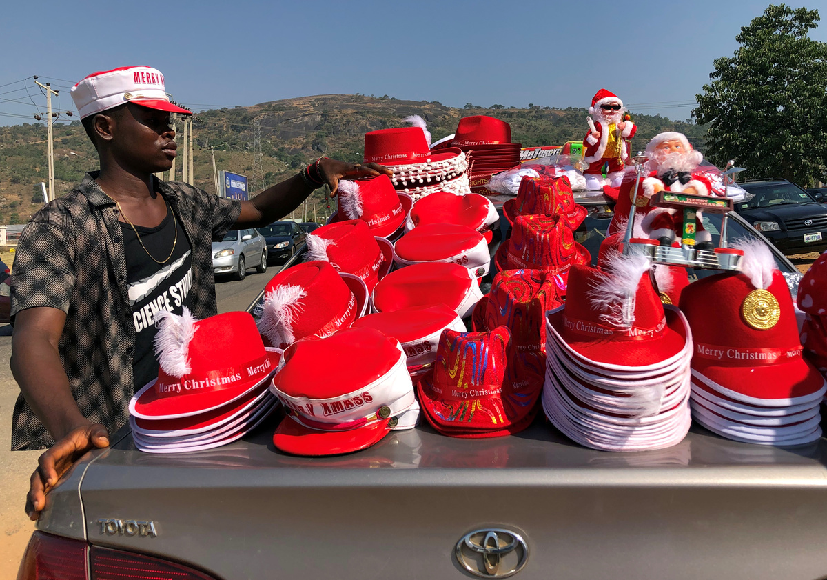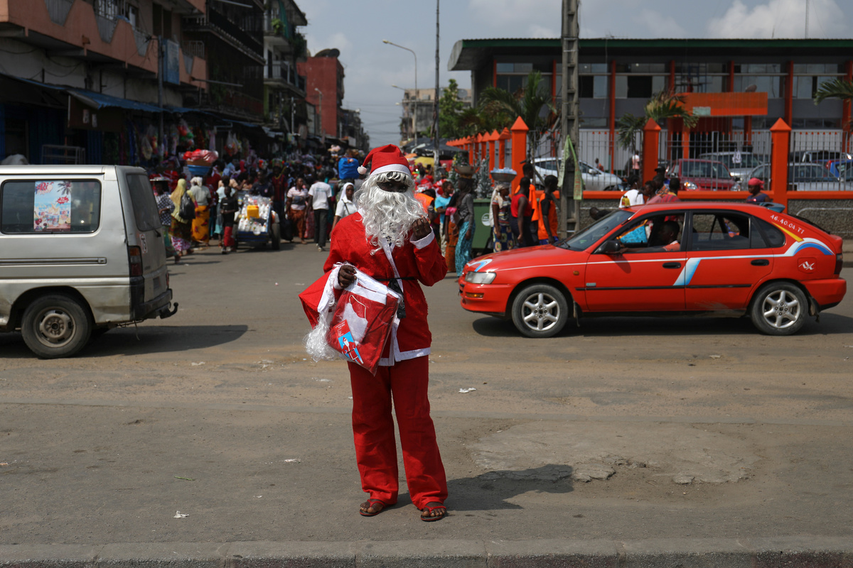 Patrick Ngatia, a street merchant, prepares to peddle Christmas commodities to motorists along Kipande road near the central business district of Nairobi, Kenya December 19, 2018. Picture taken December 19, 2018. REUTERS/Njeri MwangiStreet vendor, Nike Mawa, 20, dressed as Santa Claus, sells Christmas items in Adjame neighbourhood in Abidjan, Ivory Coast December 18, 2018. Picture taken December 18, 2018. REUTERS/Luc GnagoStreet vendor, Eko Onyewuchi, 35, sells Christmas items displayed on a car in Abuja, Nigeria December 16, 2018. Picture taken December 16, 2018. REUTERS/Afolabi SotundePatrick Ngatia, a street merchant, wears a plastic Santa Claus mask as he prepares to peddle Christmas commodities to motorists along Kipande road near the central business district of Nairobi, Kenya December 19, 2018. Picture taken December 19, 2018. REUTERS/Njeri MwangiMarcelin Sie, 18, wearing a Santa Claus hat, sells children's bicycles along a street in Koumassi, in Abidjan, Ivory Coast, December 19, 2018. Picture taken December 19, 2018. REUTERS/Thierry GouegnonStreet vendor, Fatim Kone, 25, wears Santa Claus' hat while selling Christmas items in Williamsville area of Abidjan, Ivory Coast December 18, 2018. Picture taken December 18, 2018. REUTERS/Luc Gnago