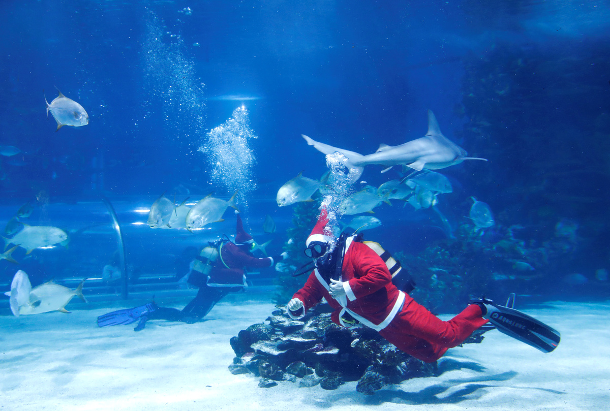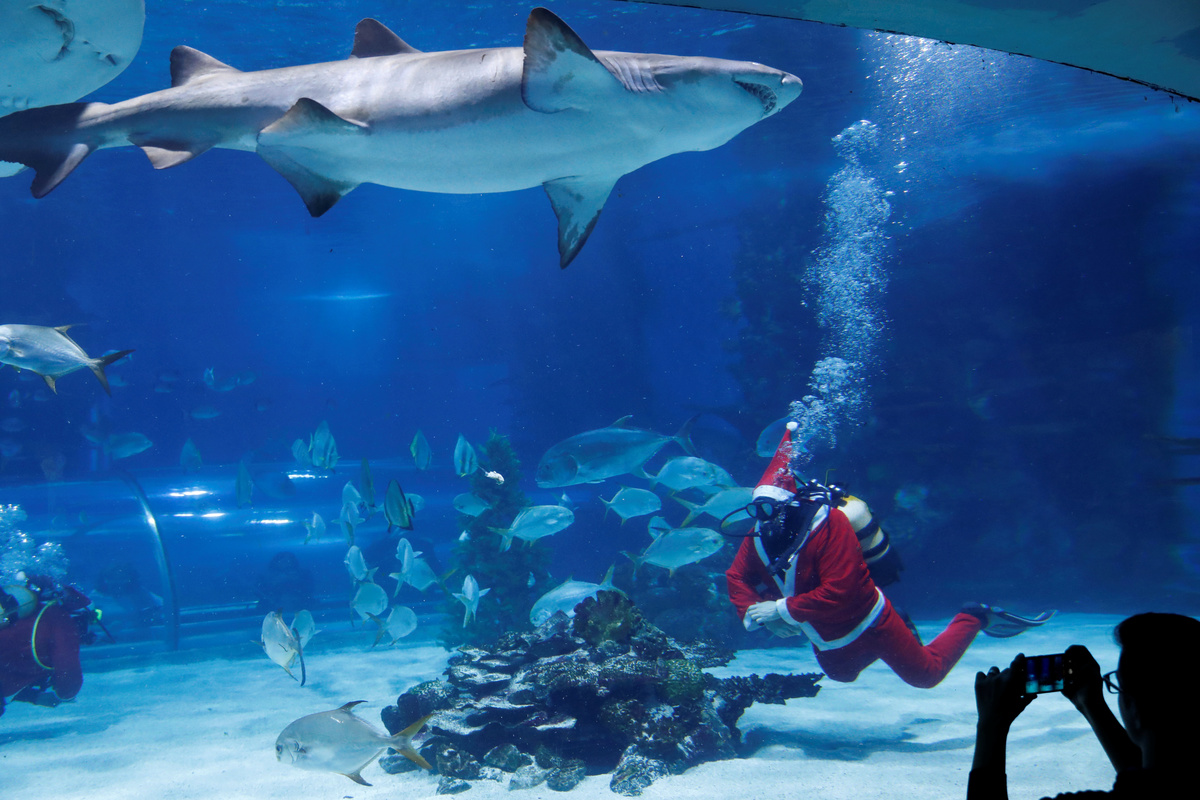 The Tropicarium Aquarium in Budapest prepared a festive surprise for its seven sharks and other fish, sending divers dressed as Santa into the 1.4 million liter aquarium to set up a Christmas tree, which they decorated with shells.