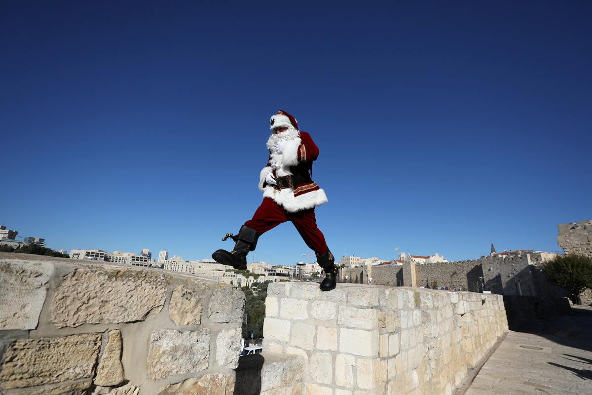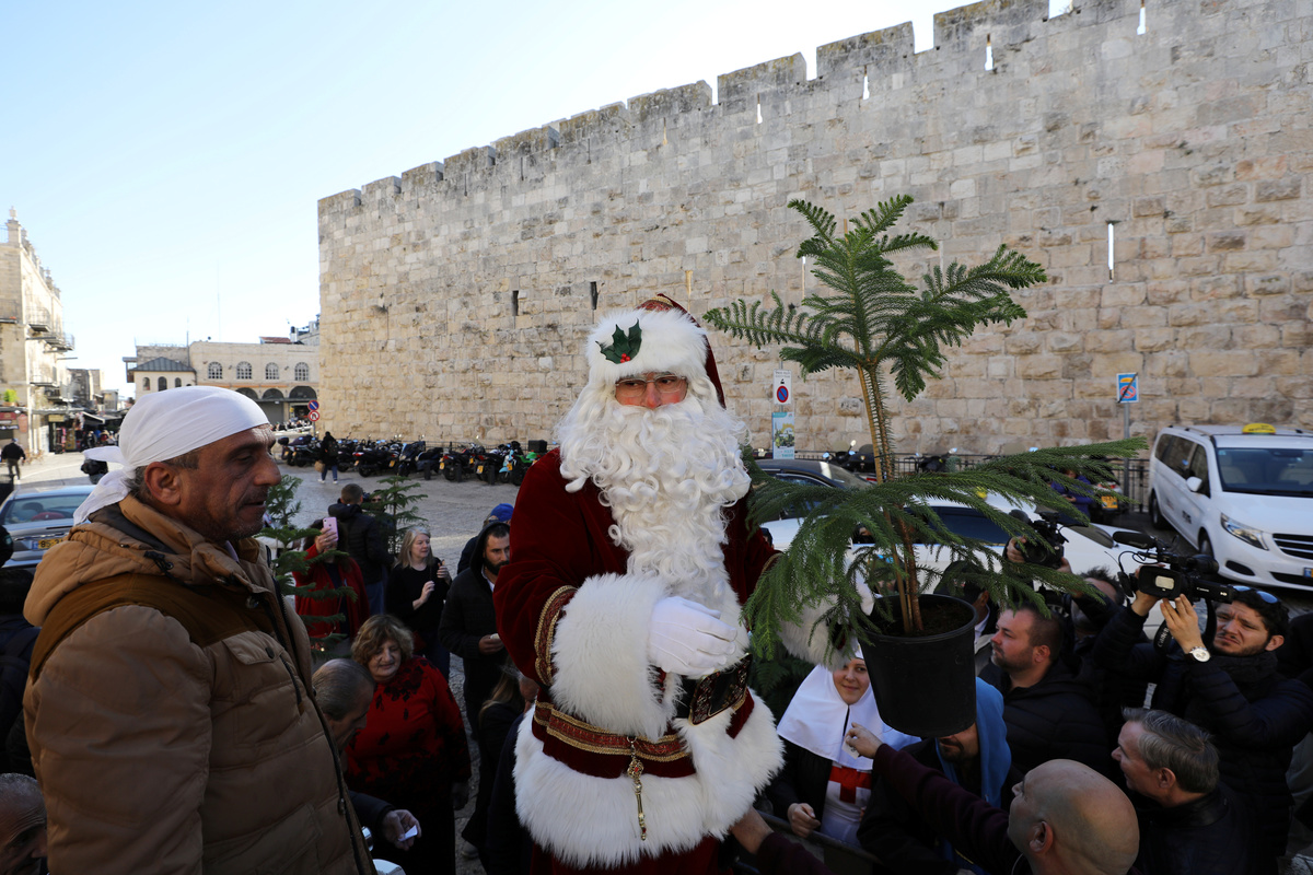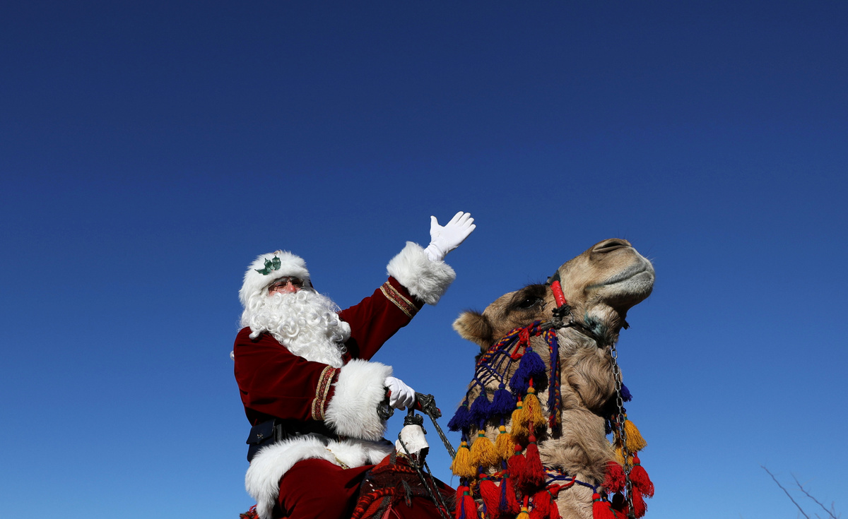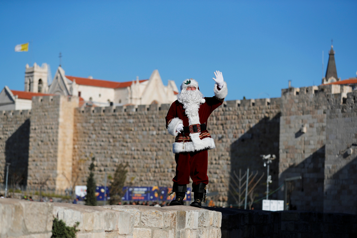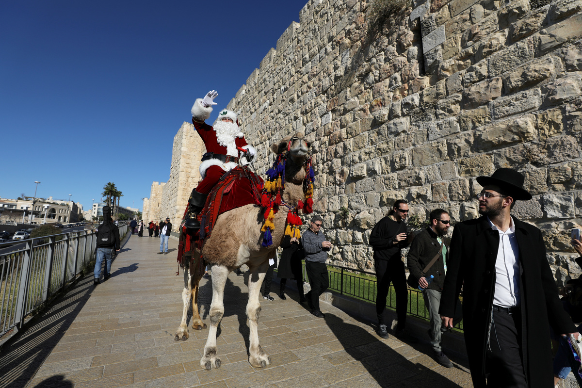 JERUSALEM (Reuters) - Along the ancient walls of Jerusalem's Old City, a man dressed as Santa Claus tries to raise holiday cheer from atop a camel by offering free Christmas trees to residents.
