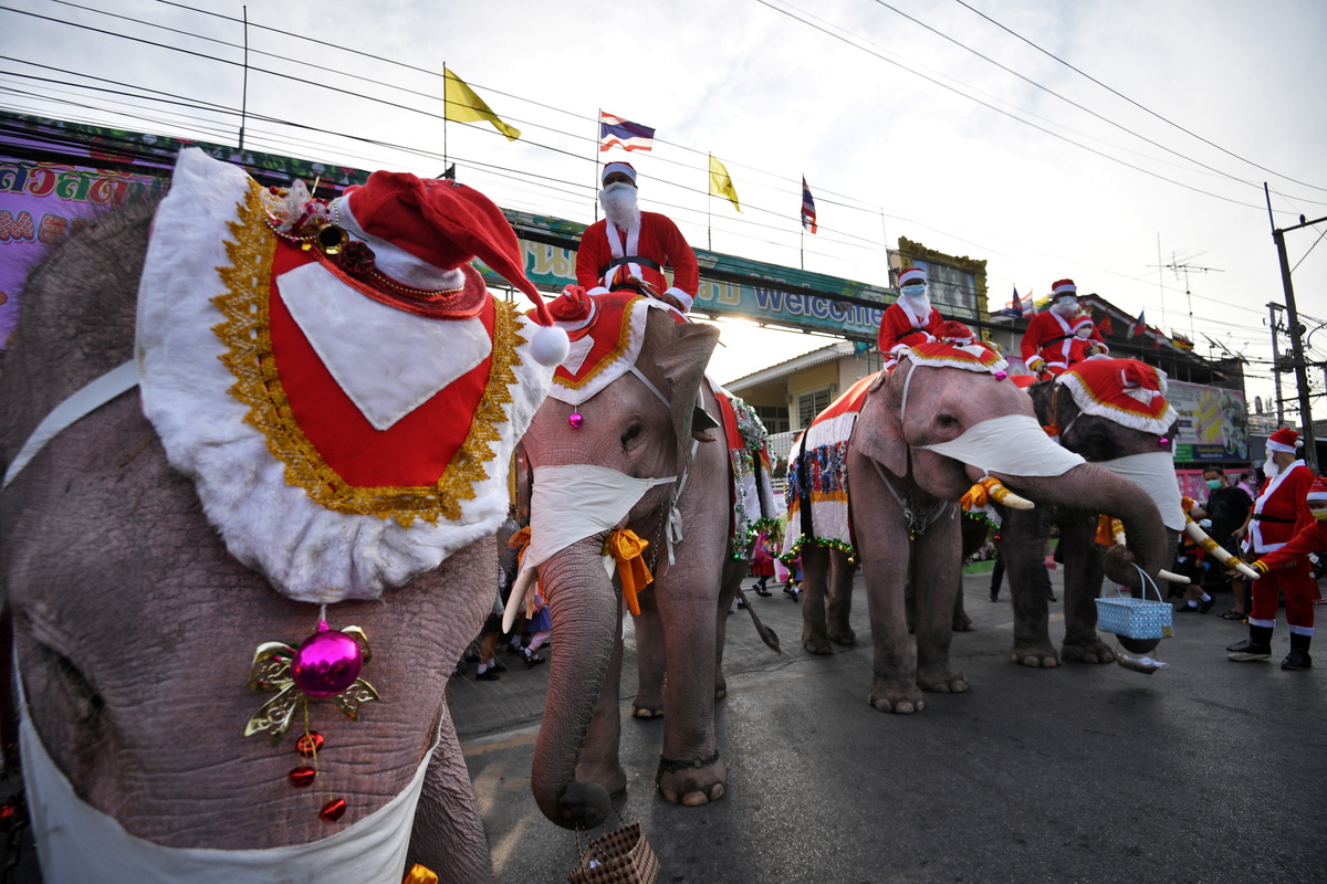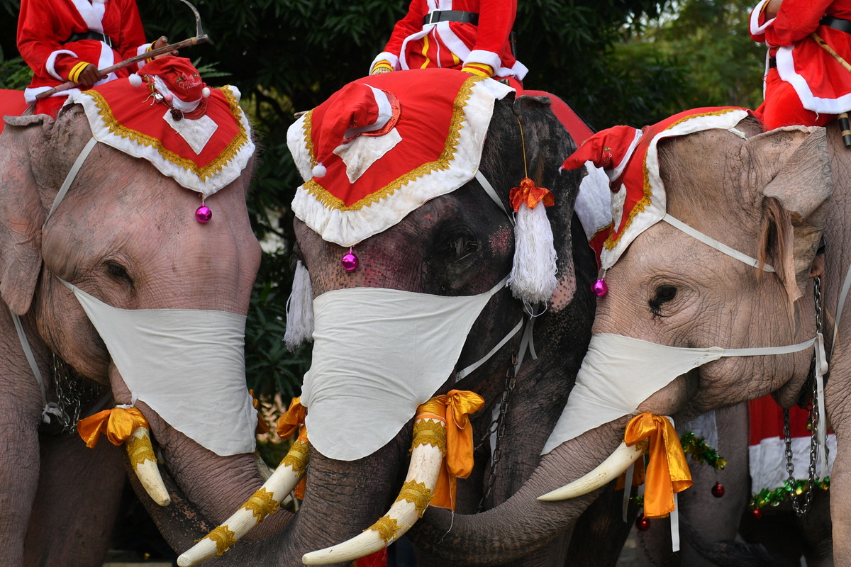 White-bearded handlers in floppy hats and Santa outfits sat atop elephants decked out in tinsel and trunk masks in the central province of Ayutthaya, distributing protective masks in baskets to schoolchildren, motorcyclists and drivers passing by.