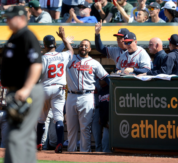 It was the second time that Swanson doubled to score Santana, who stole three bases Saturday to make a huge impact on a Braves win for the second consecutive game to start the three-game series. Jim Johnson recorded his 18th consecutive save and second in as many days against his former A's team.