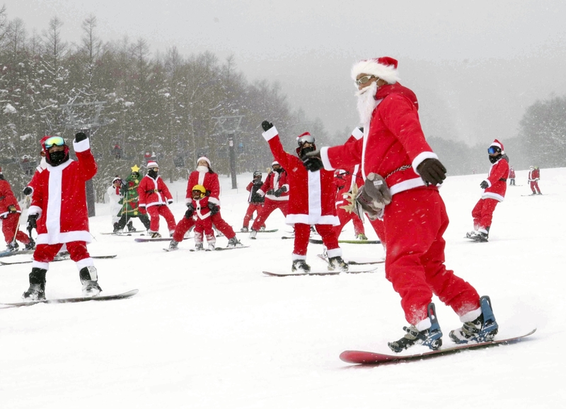 NASU, Tochigi -- About 100 people dressed up as Santa Claus to ski and snowboard at Mt. Jeans in Nasu, Tochigi Prefecture, for an annual Christmas event.