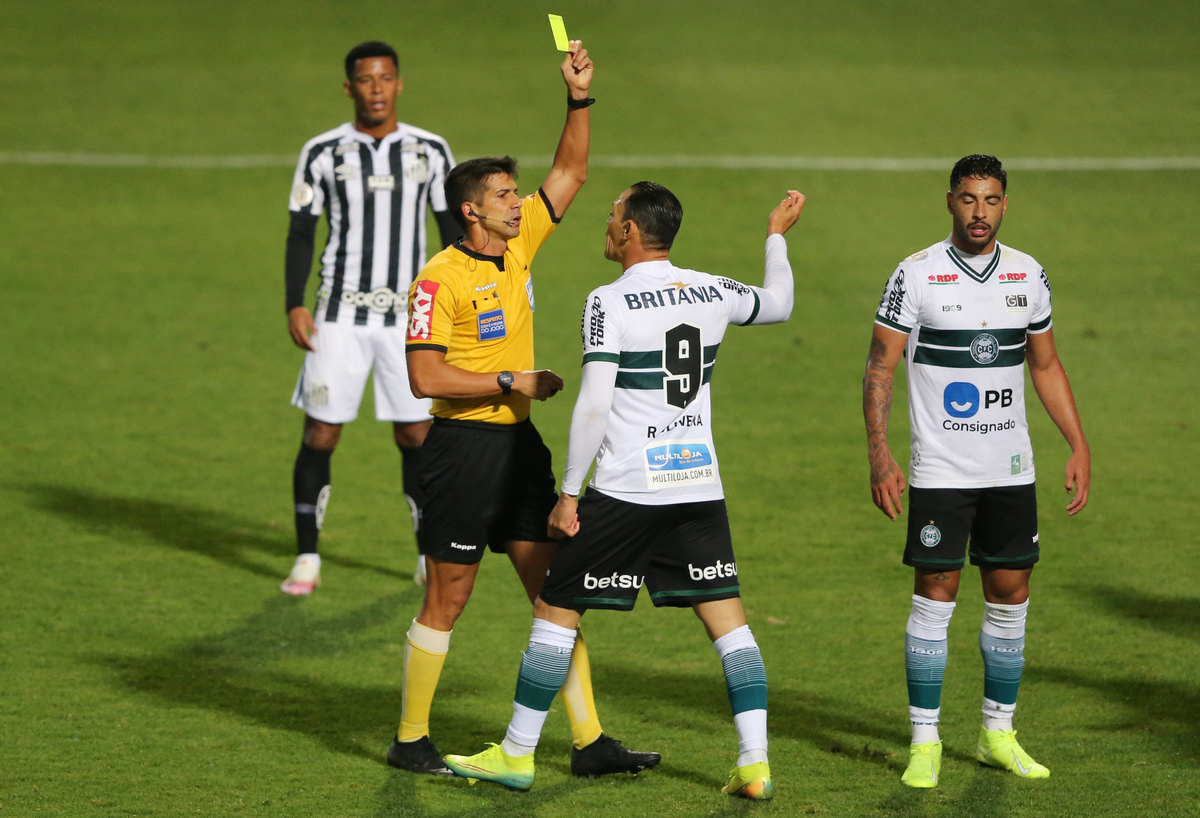 Soccer Football - Brasileiro Championship - Coritiba v Santos - Couto Pereira Stadium, Curitiba, Brazil - October 17, 2020 Coritiba's Ricardo Oliveira is shown a yellow card by referee Bruno Arleu REUTERS/Rodolfo Buhrer