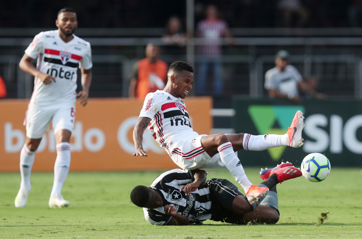 Soccer Football - Brasileiro Championship - Sao Paulo v Botafogo - Morumbi Stadium, Sao Paulo, Brazil - April 27, 2019 Sao Paulo's Antony in action with Botafogo’s Pimpao REUTERS/Amanda PerobelliSoccer Football - Brasileiro Championship - Sao Paulo v Botafogo - Morumbi Stadium, Sao Paulo, Brazil - April 27, 2019 Sao Paulo's Everton celebrates scoring their first goal with Sao Paulo's Antony REUTERS/Amanda PerobelliSoccer Football - Brasileiro Championship - Sao Paulo v Botafogo - Morumbi Stadium, Sao Paulo, Brazil - April 27, 2019 Sao Paulo’s Alexander Pato reacts during the match REUTERS/Amanda PerobelliSoccer Football - Brasileiro Championship - Sao Paulo v Botafogo - Morumbi Stadium, Sao Paulo, Brazil - April 27, 2019 Botafogo’s Pimpao in action REUTERS/Amanda PerobelliSoccer Football - Brasileiro Championship - Sao Paulo v Botafogo - Morumbi Stadium, Sao Paulo, Brazil - April 27, 2019 Botafogo’s Jonathan in action with Sao Paulo’s Tche Tche REUTERS/Amanda PerobelliSoccer Football - Brasileiro Championship - Sao Paulo v Botafogo - Morumbi Stadium, Sao Paulo, Brazil - April 27, 2019 Sao Paulo fans during the match REUTERS/Amanda PerobelliSoccer Football - Brasileiro Championship - Sao Paulo v Botafogo - Morumbi Stadium, Sao Paulo, Brazil - April 27, 2019 Sao Paulo coach Cuca with Hernanes REUTERS/Amanda PerobelliSoccer Football - Brasileiro Championship - Sao Paulo v Botafogo - Morumbi Stadium, Sao Paulo, Brazil - April 27, 2019 Botafogo coach Eduardo de Souza REUTERS/Amanda Perobelli