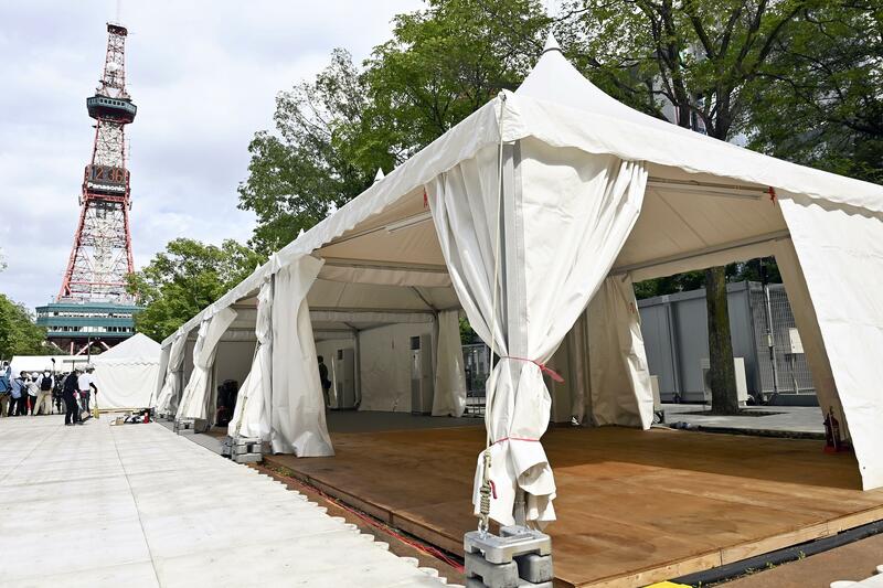 Odori Park, the starting and finishing point for the marathon and race walking events, was opened to the press on Monday. Some areas of the park has been closed to the public since mid-April, and the construction of facilities for the events was underway.